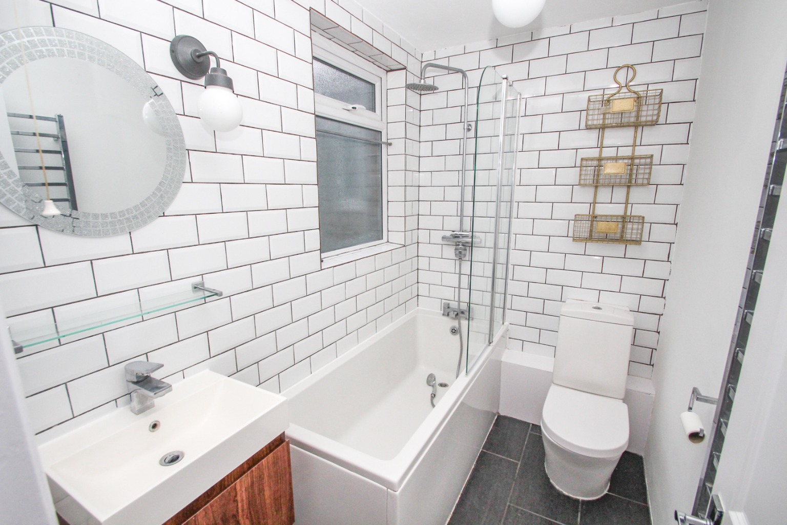 The tiled bathroom has a modern style three piece suite, including a shower and screen to the bath, wall mounted wash basin with a single lever mixer tap and a toilet and a frosted double glazed window.