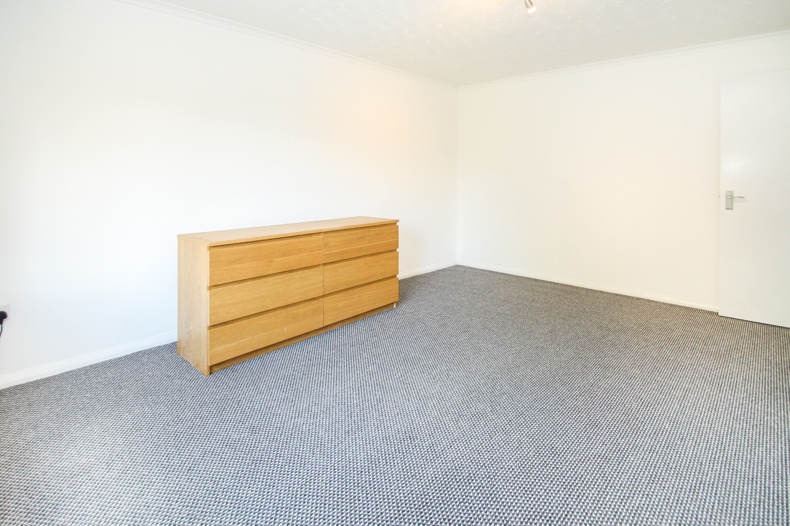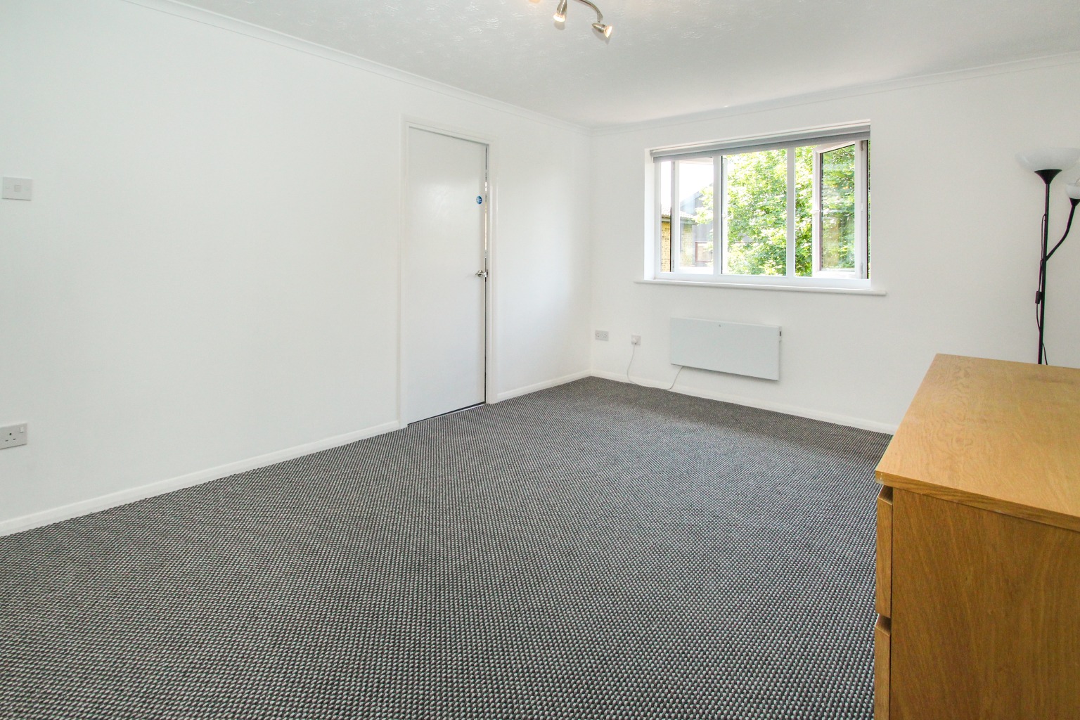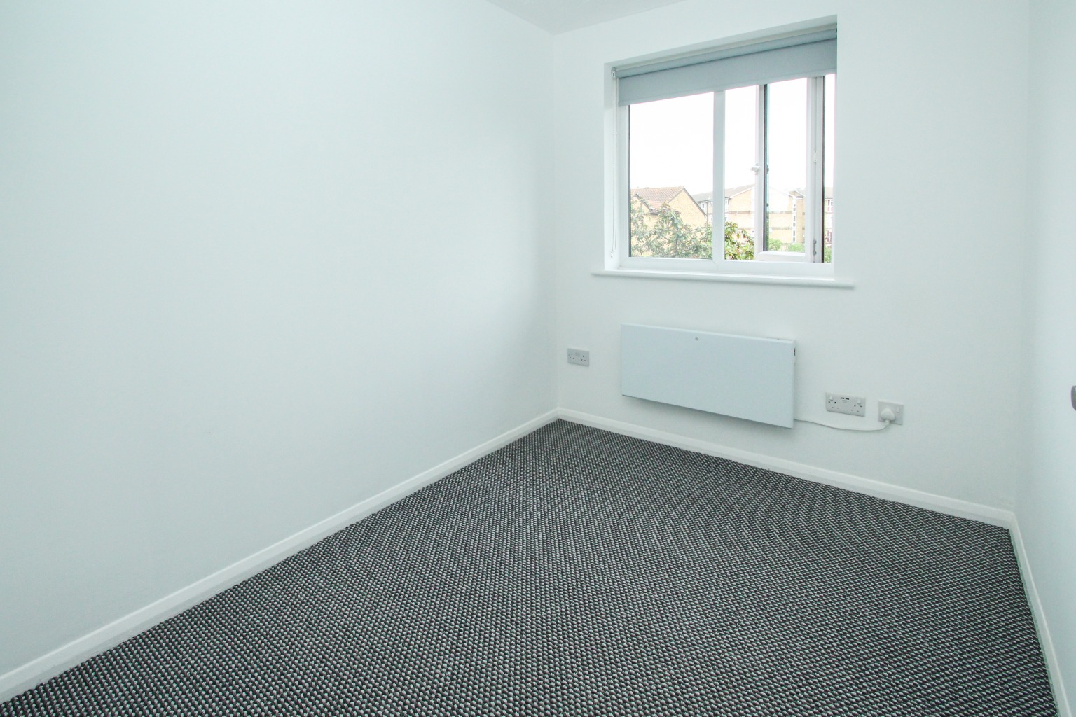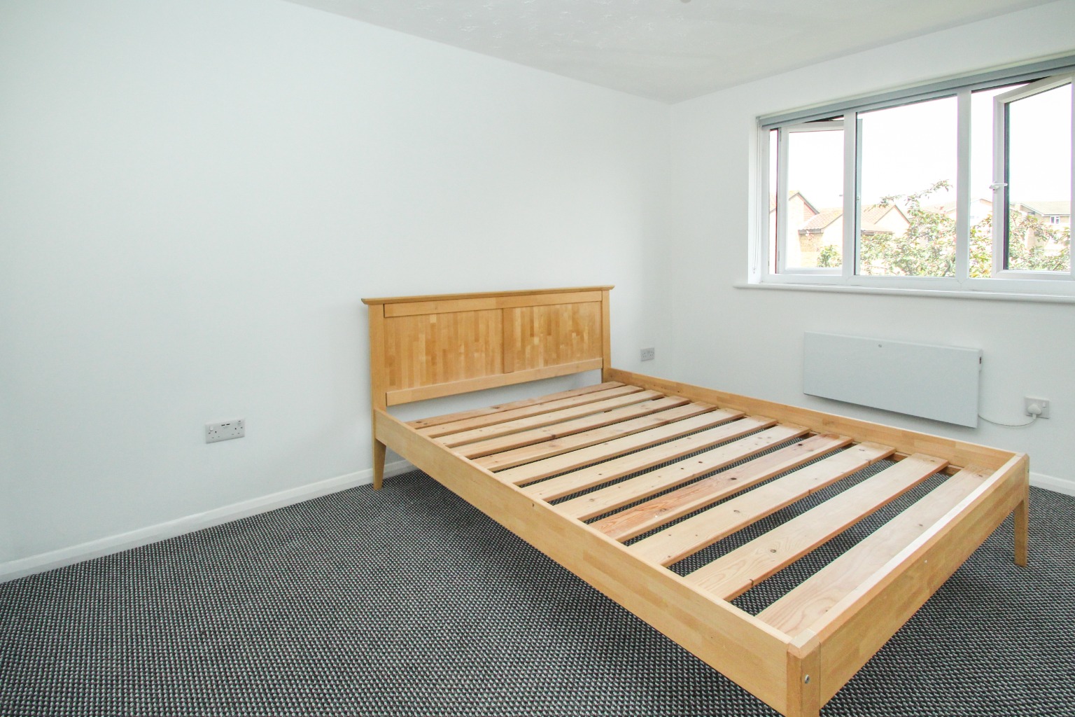 Bedroom one is a double-sized room, with grey fleck carpet, white walls and a double glazed window.