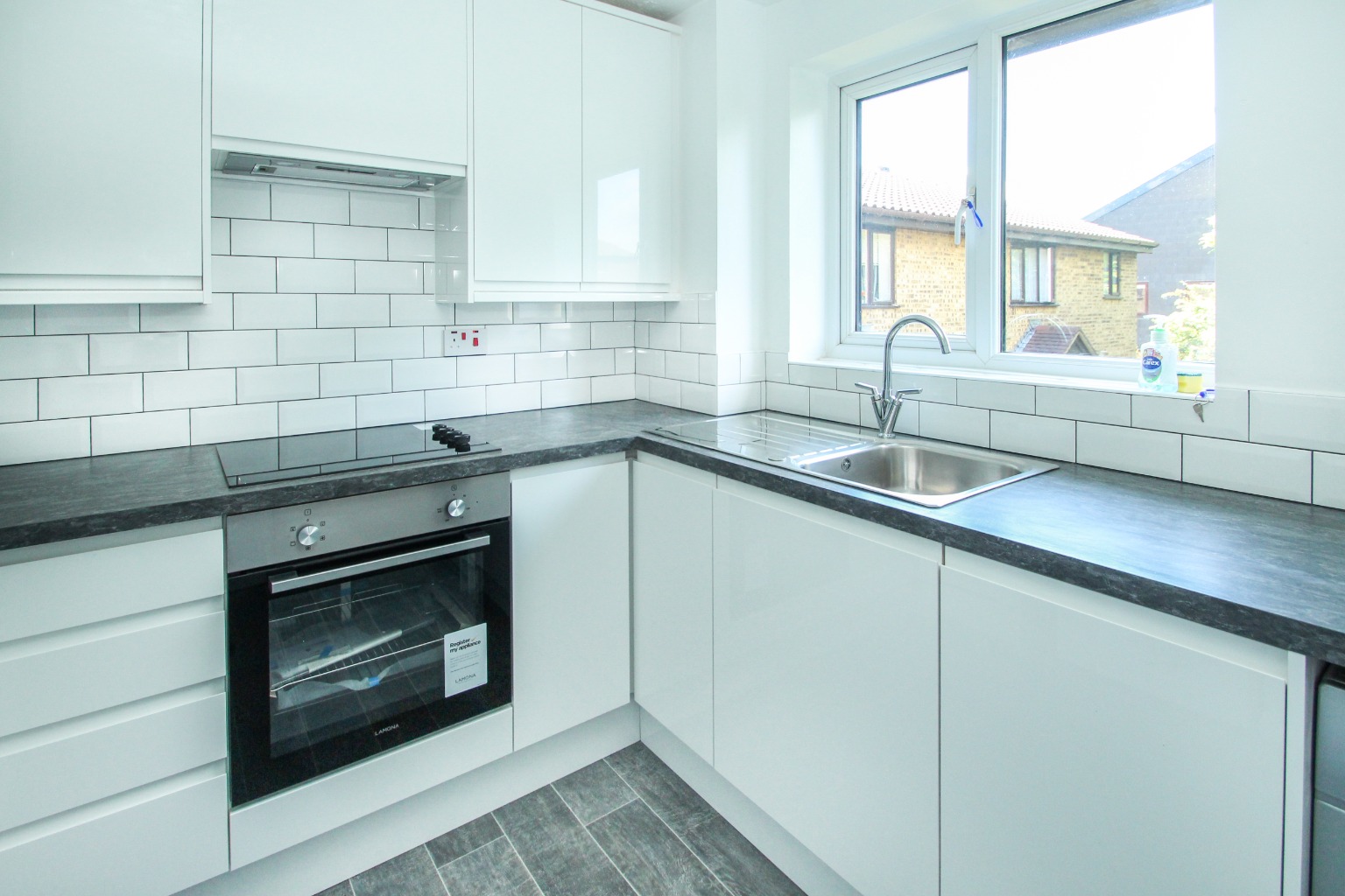 The kitchen has fitted grey wood-effect vinyl floor covering, high gloss white wall and base units with contrasting grey worktops. There is also a storage cupboard, a double glazed window and new appliances, including a washing/dryer, dishwasher, fridge/freezer, elective hob and oven.