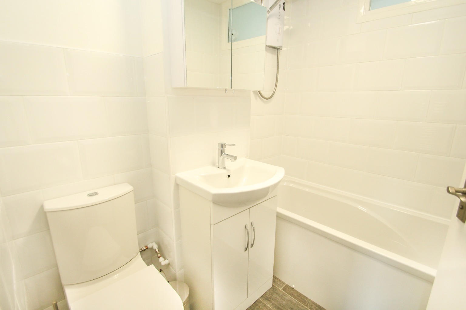 In the bathroom, continuing the theme, there is a grey wood-effect vinyl floor covering, stainless steel heated towel rail, a mirrored medicine cabinet, tiled walls around the recently fitted white suite comprising a panelled bath with a wall-mounted Mira power shower, washbasin and low-level button flush toilet.