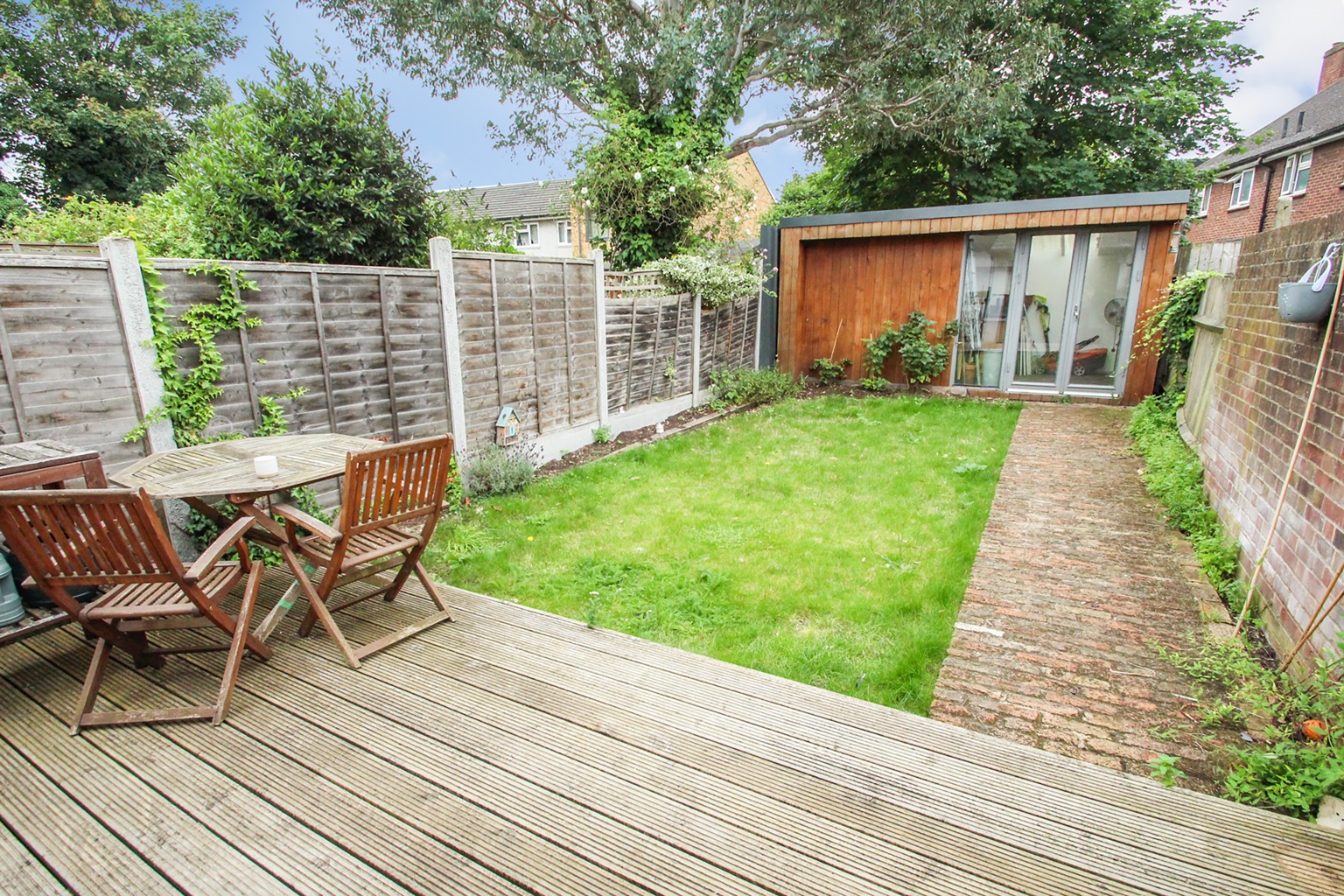 At the end of the hallway, we have what some may regard as the hub of the home, in the shape of a kitchen/diner, with solid oak flooring, underfloor heating, adequate work surfaces, fitted units, plus plenty of space for a dining table and chairs, meaning meal times can still be a family time. At the rear of the room, there are bi-folding full-length doors, opening out to the garden in a way which really connects you with the outside space; perfect for entertaining friends and family. As you step out onto the raised decking area, you'll find ample space for a spot of al fresco dining or breakfast with the papers on a Saturday morning. The well-maintained garden features a lawn area with flower beds to the side, and a brick path leading down to a fantastic studio style outhouse, a perfect place to use as a garden office, yoga studio or workshop. It is fully insulated and with its own power supply.
