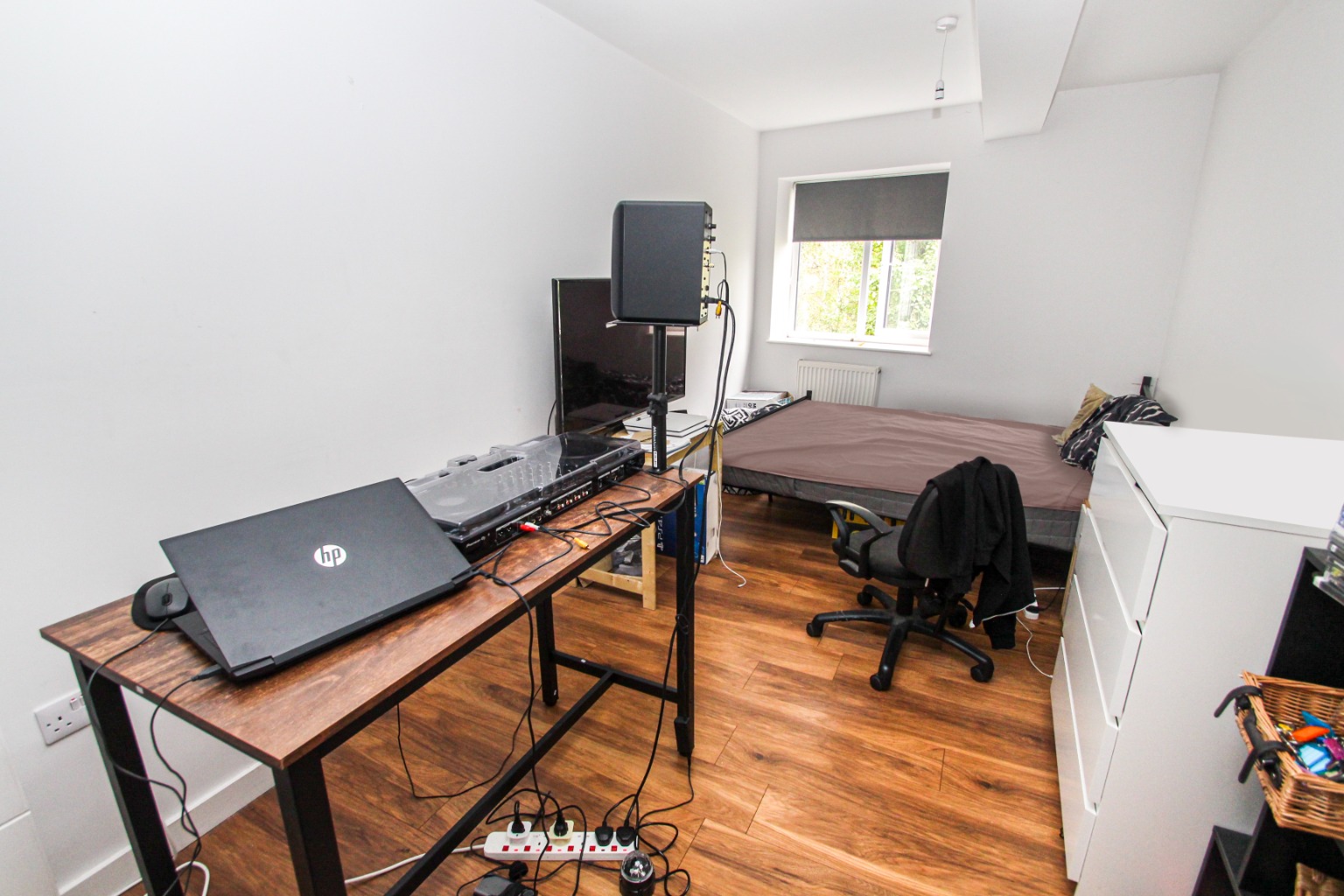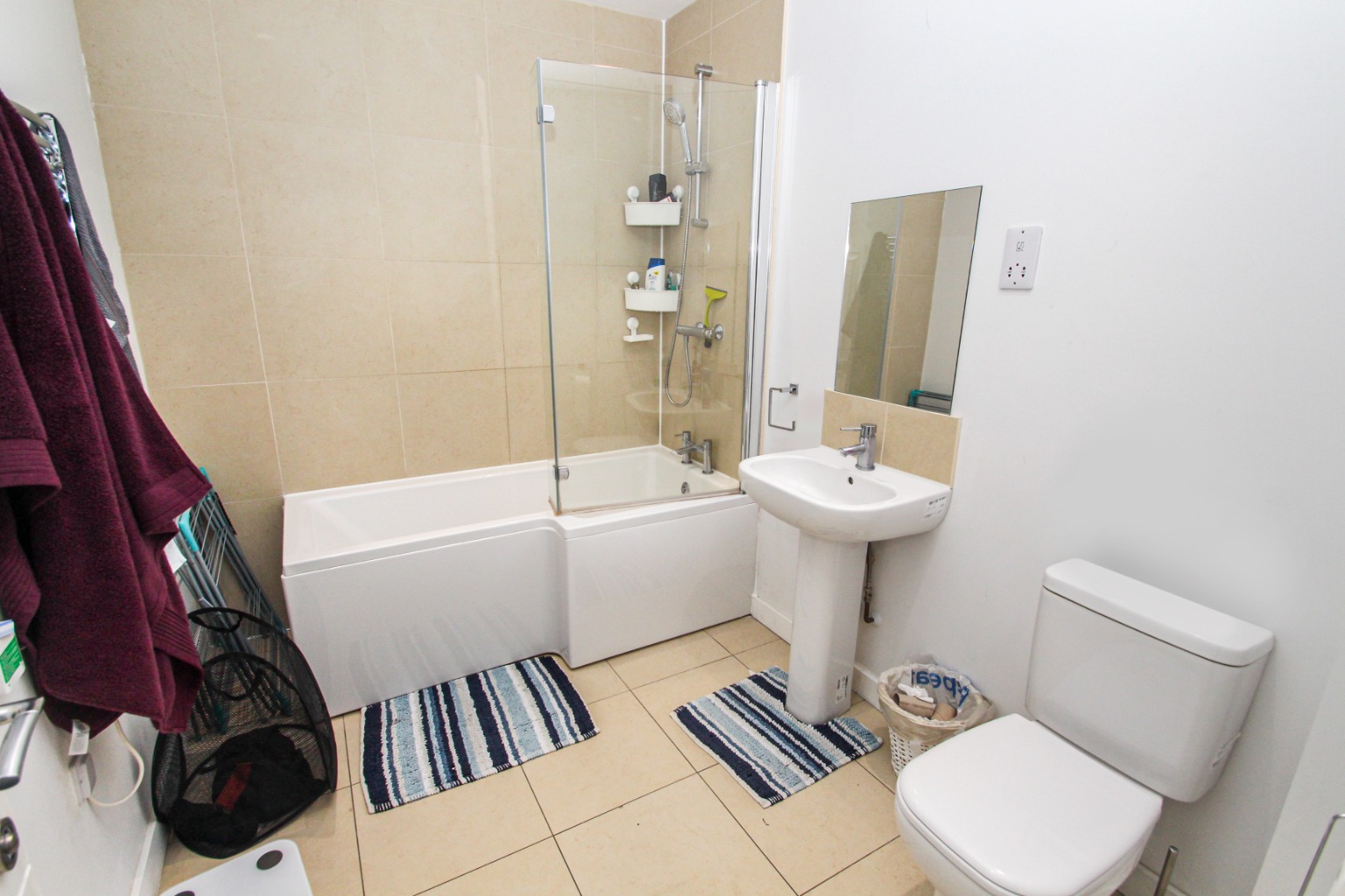 On entering the property there is easy to maintain wood effect flooring underfoot throughout the property and is neutrally decorated, allowing any tenant add their touch of character to the property with their own furnishings. From the front door and to the right are the two bedrooms, both are of reasonable dimensions and can accommodate double beds, although one is slightly more generous than the other. To the left of the entrance there is a really useful cloakroom type area, leading on to the mostly tiled three piece bathroom, which includes shower and glass splash screen to the modern style bath.