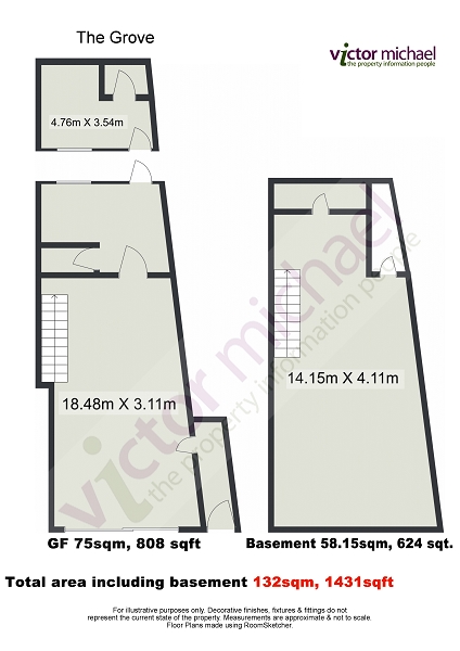 - Total area including basement 132sqm, 1431sqft