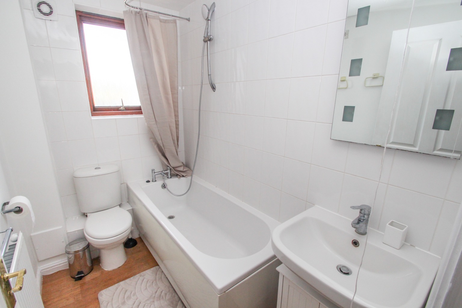 Finally, the three piece fully tiled bathroom includes a bath with shower fitting and shower curtain, under sink storage as well a mirrored cupboard and home for your toiletry items.
