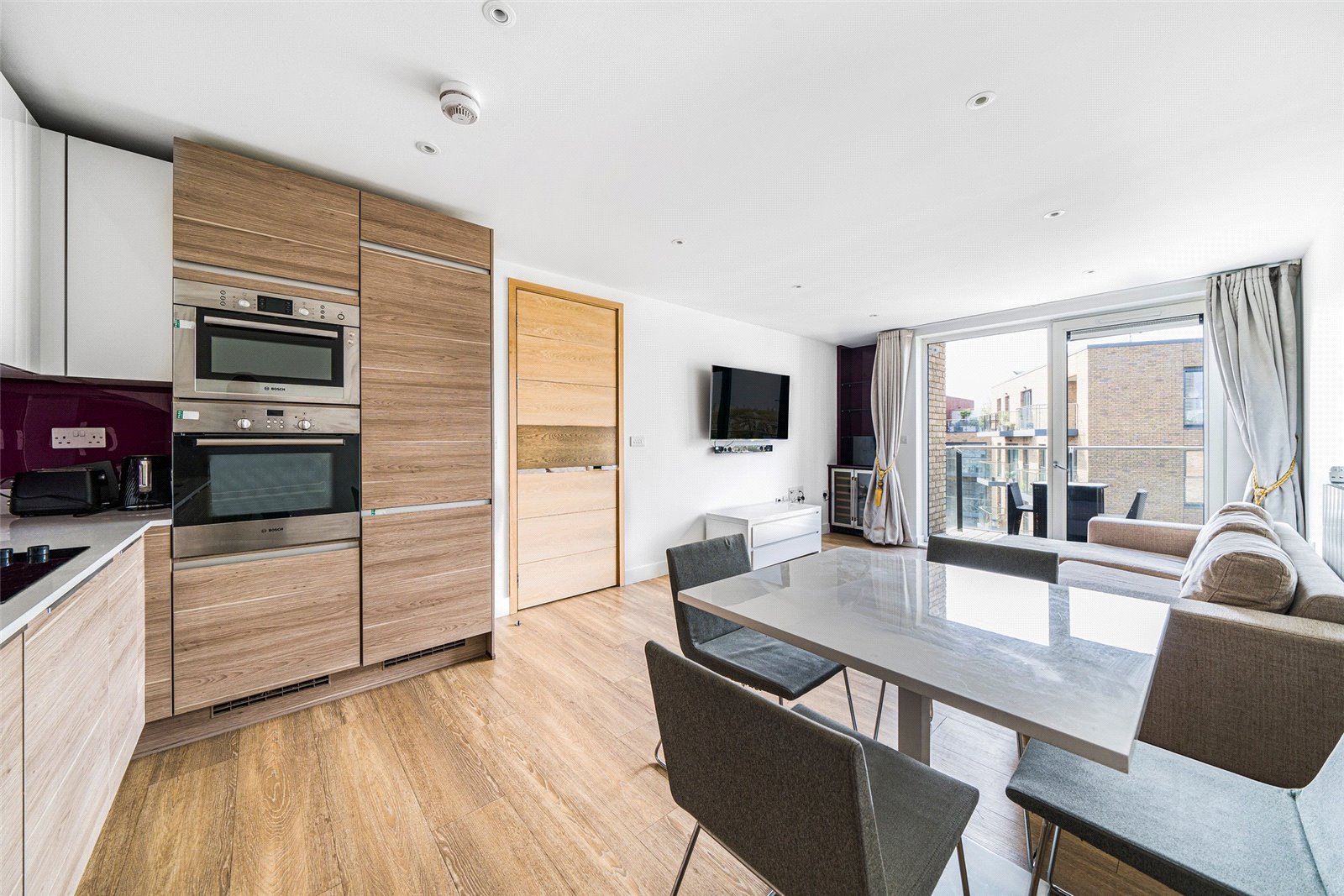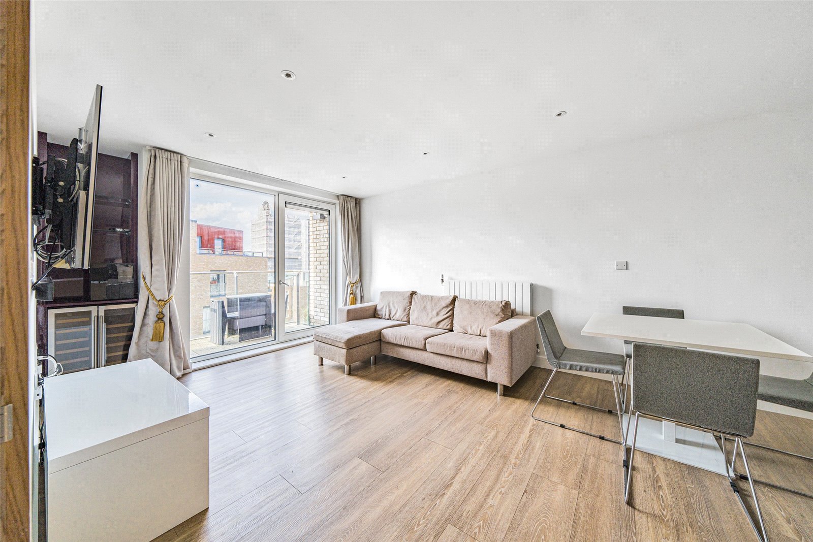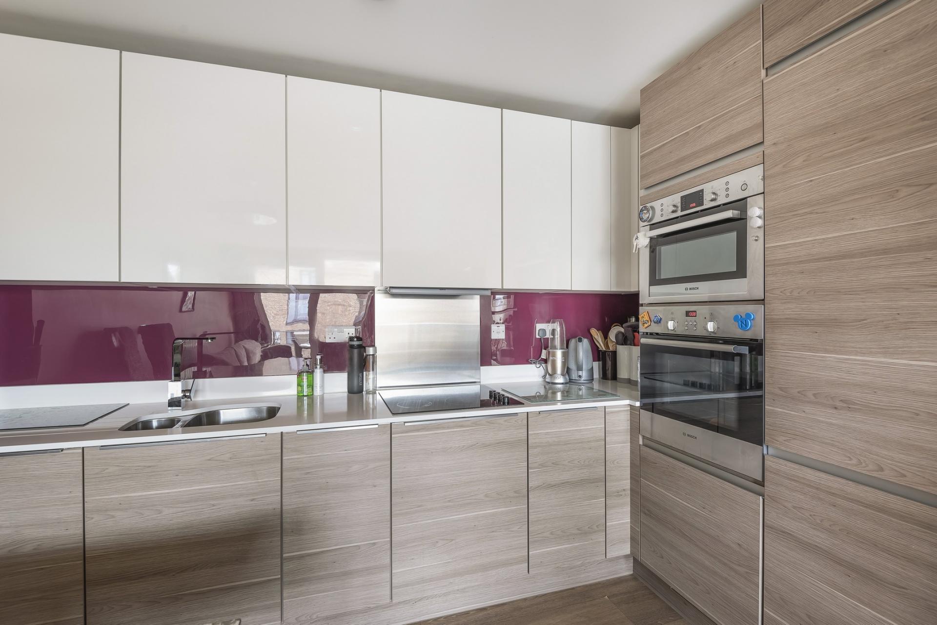 This sixth floor (top) home boasts integrated appliances (including a dishwasher and microwave), a well-insulated interior that requires little heating, availability of fast fibre broadband, elegant made-to-measure curtains, wine fridge, secure cycle store and access to the residents’ garden accessed from the first floor.
