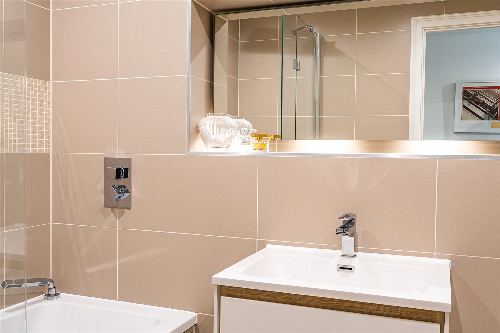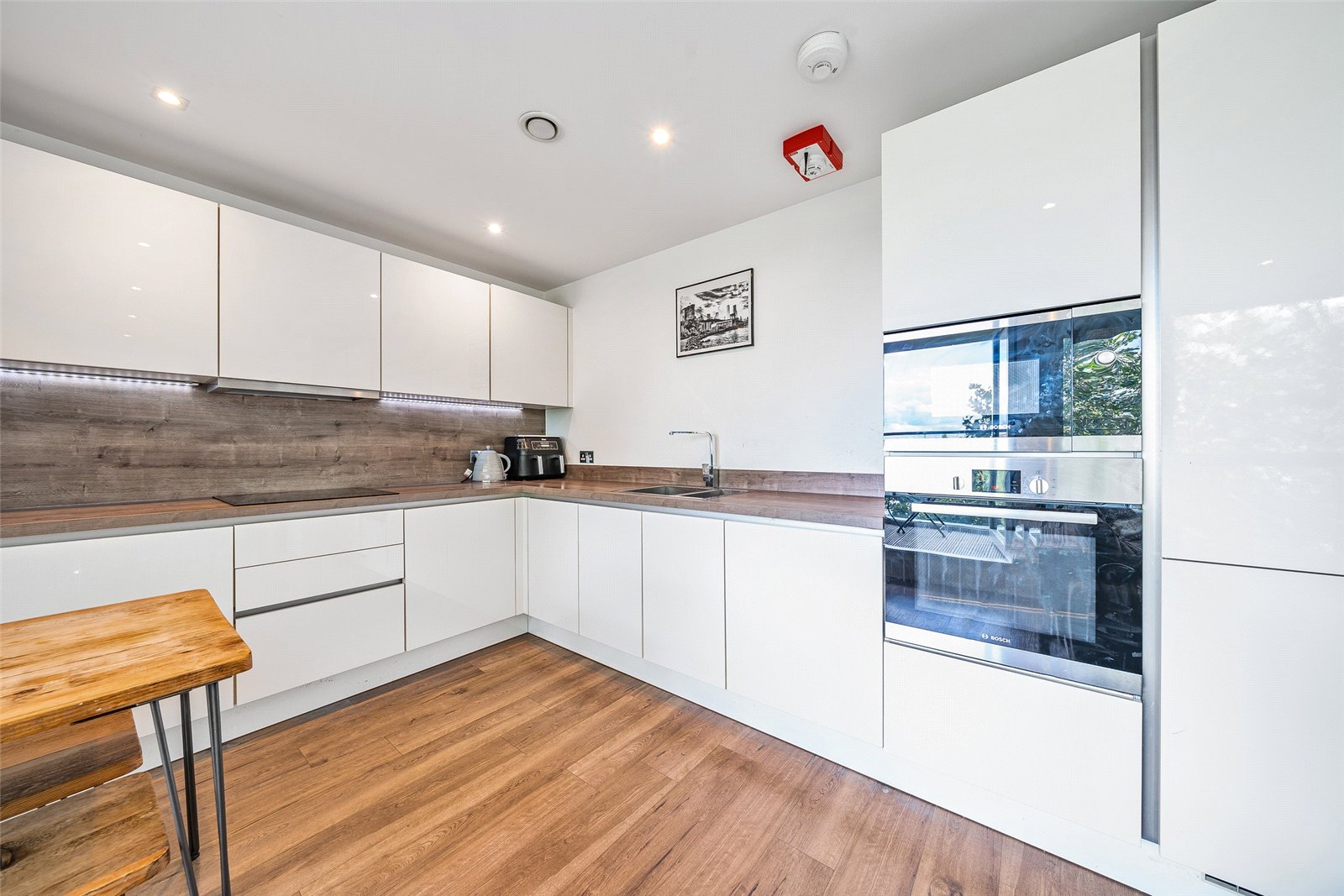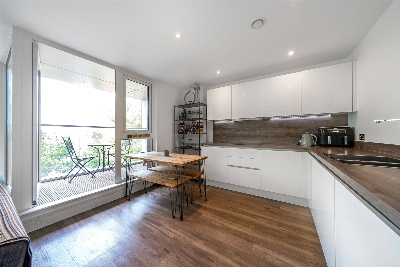 This luxurious fourth floor home features two double bedrooms, with the primary possessing fitted wardrobes and an ensuite. The reception is together with the stylish kitchen, which offers plenty of countertop space, many units and integrated appliances. The bathrooms are well-appointed and fully-tiled.
