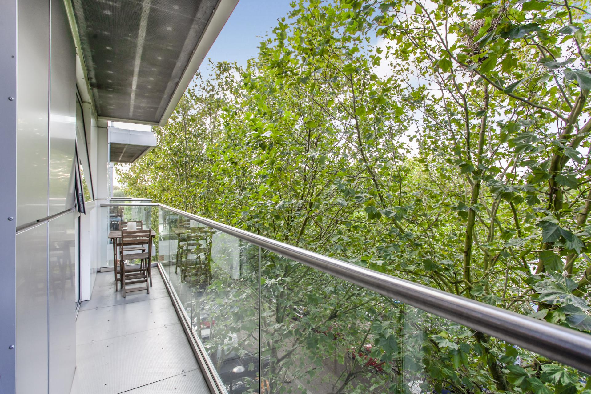 A modern apartment with a large dock-facing balcony. Situated on the second floor, it has a luxurious bathroom, a sociab...