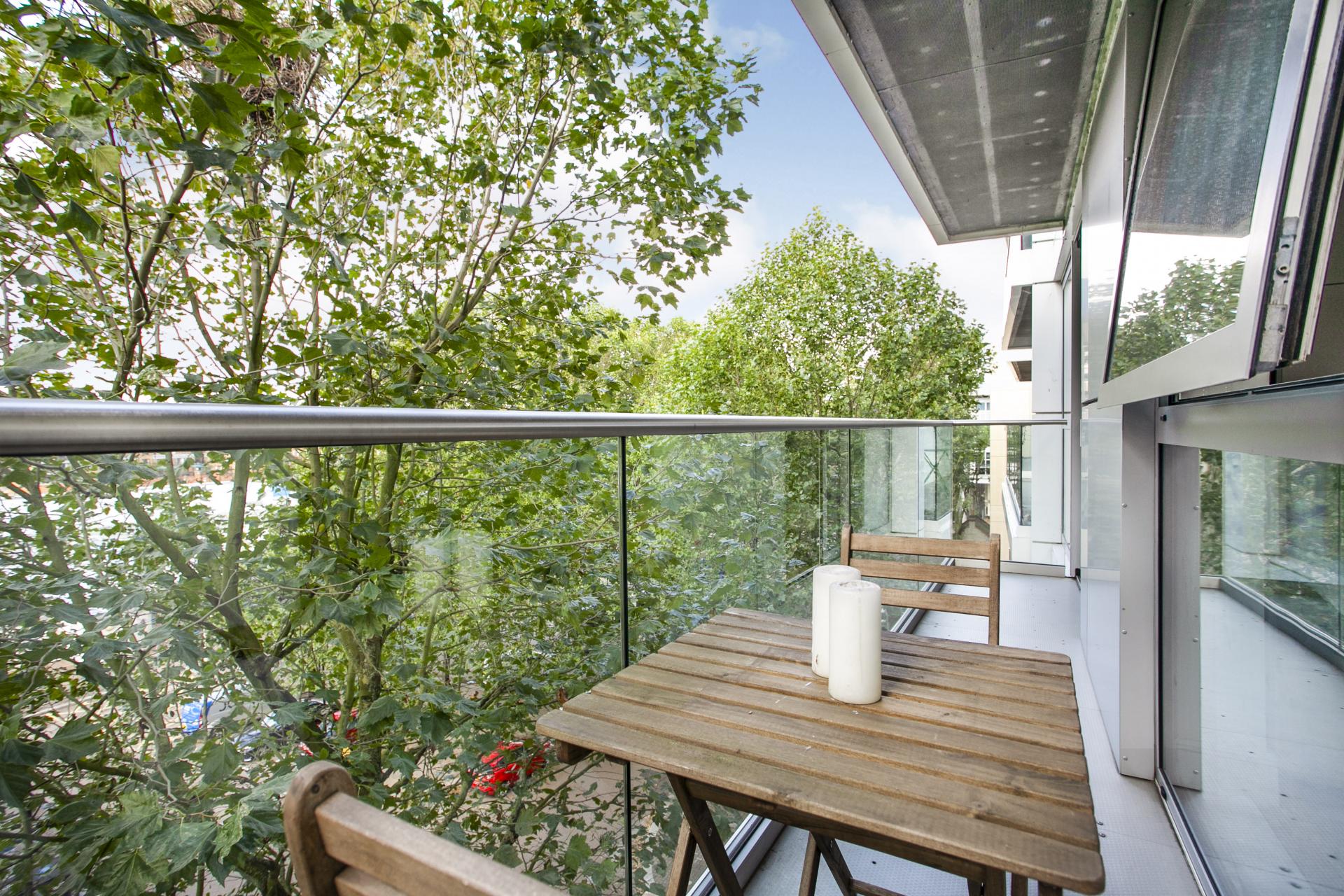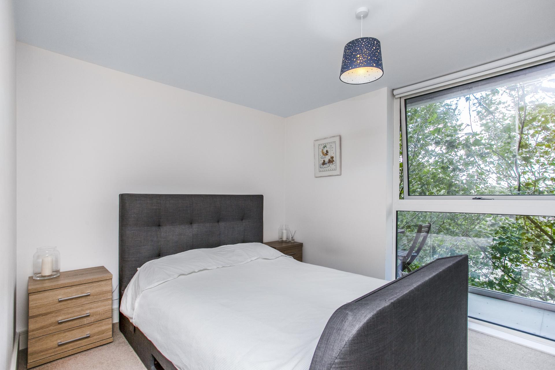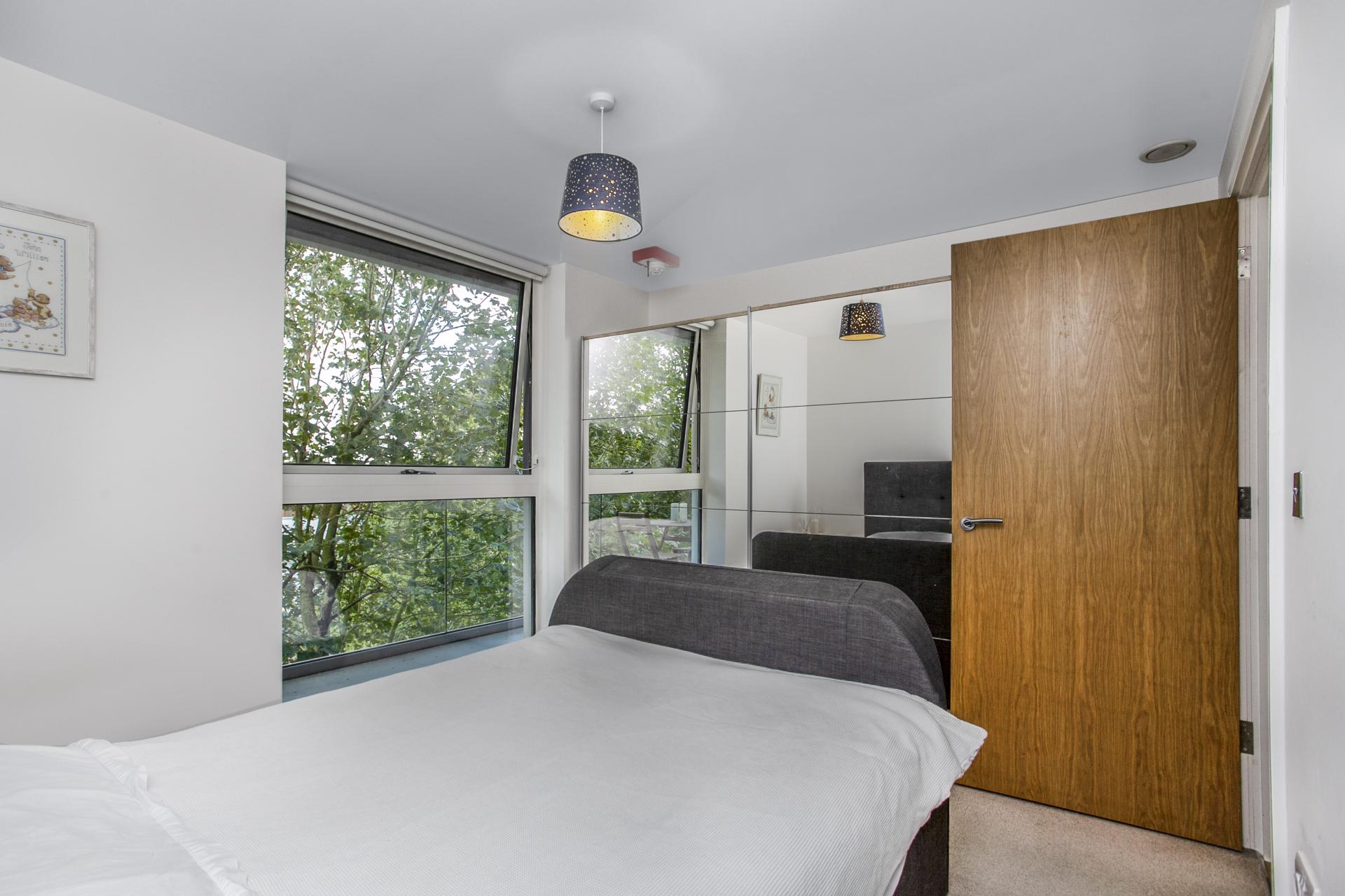 A modern apartment with a large dock-facing balcony in a recently built development. Set on the fourth floor, it has a luxurious bathroom, a sociable living area with open-plan kitchen, huge storage room, onsite concierge and is easily accessible to stations and local amenities.
