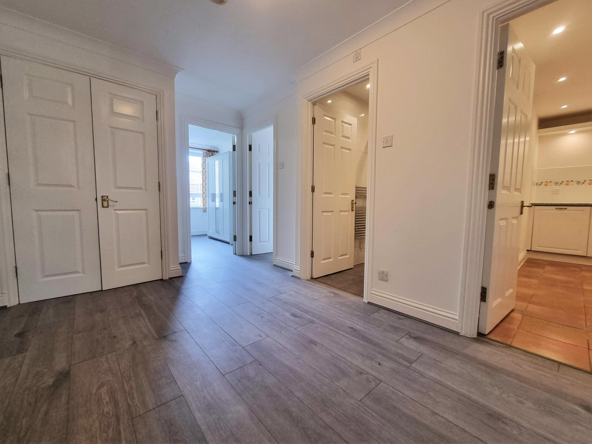 Both double bedrooms overlook the garden, while the master benefits from an ensuite bathroom and fitted wardrobes. The larger than average hall is practically another room and would make for a perfect home office area. The open-plan reception is entered through double doors and has plenty of space to relax and dine, you can also access the water-facing balcony from both sets of patio doors. The separate kitchen is well-maintained and includes a full-size dishwasher.