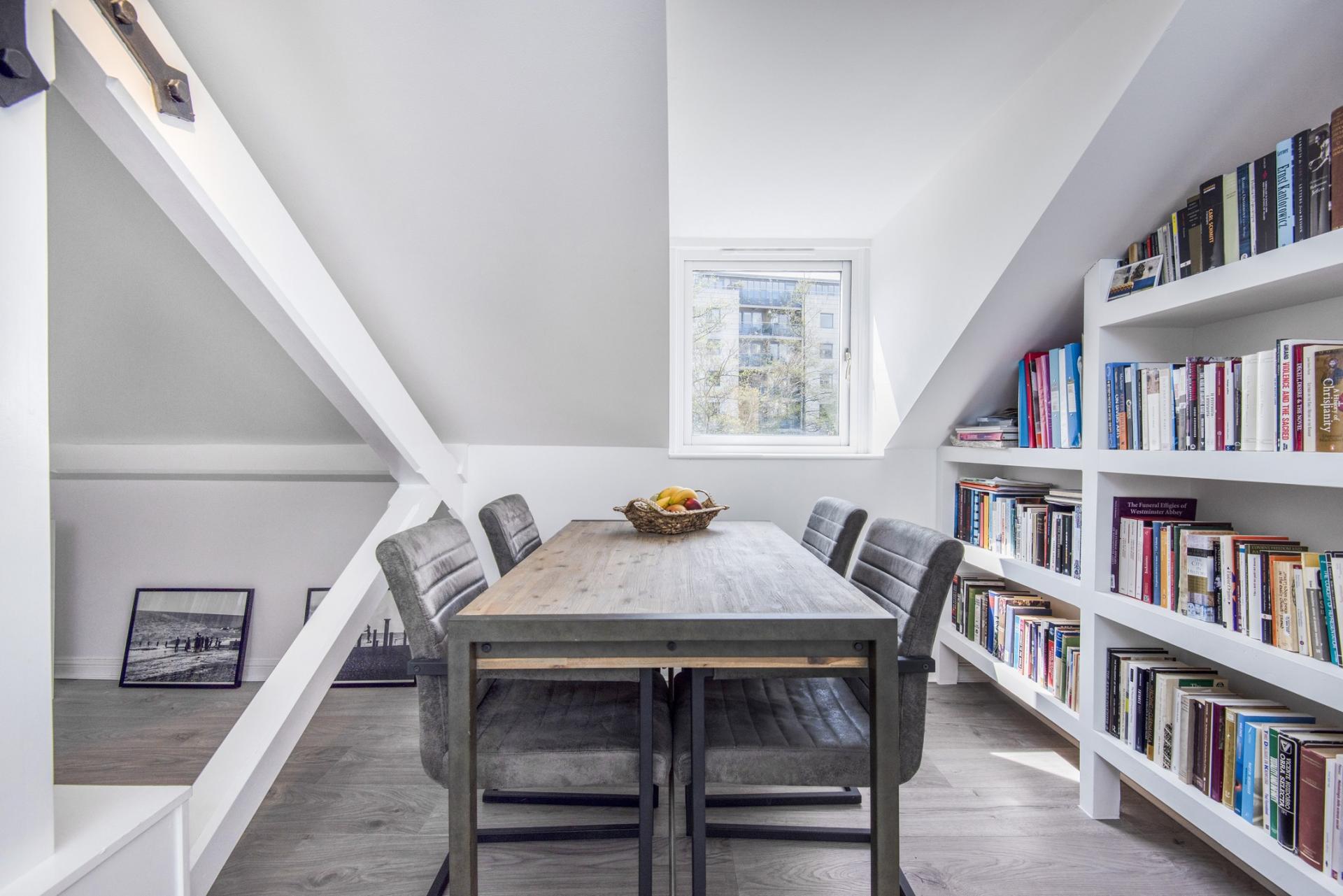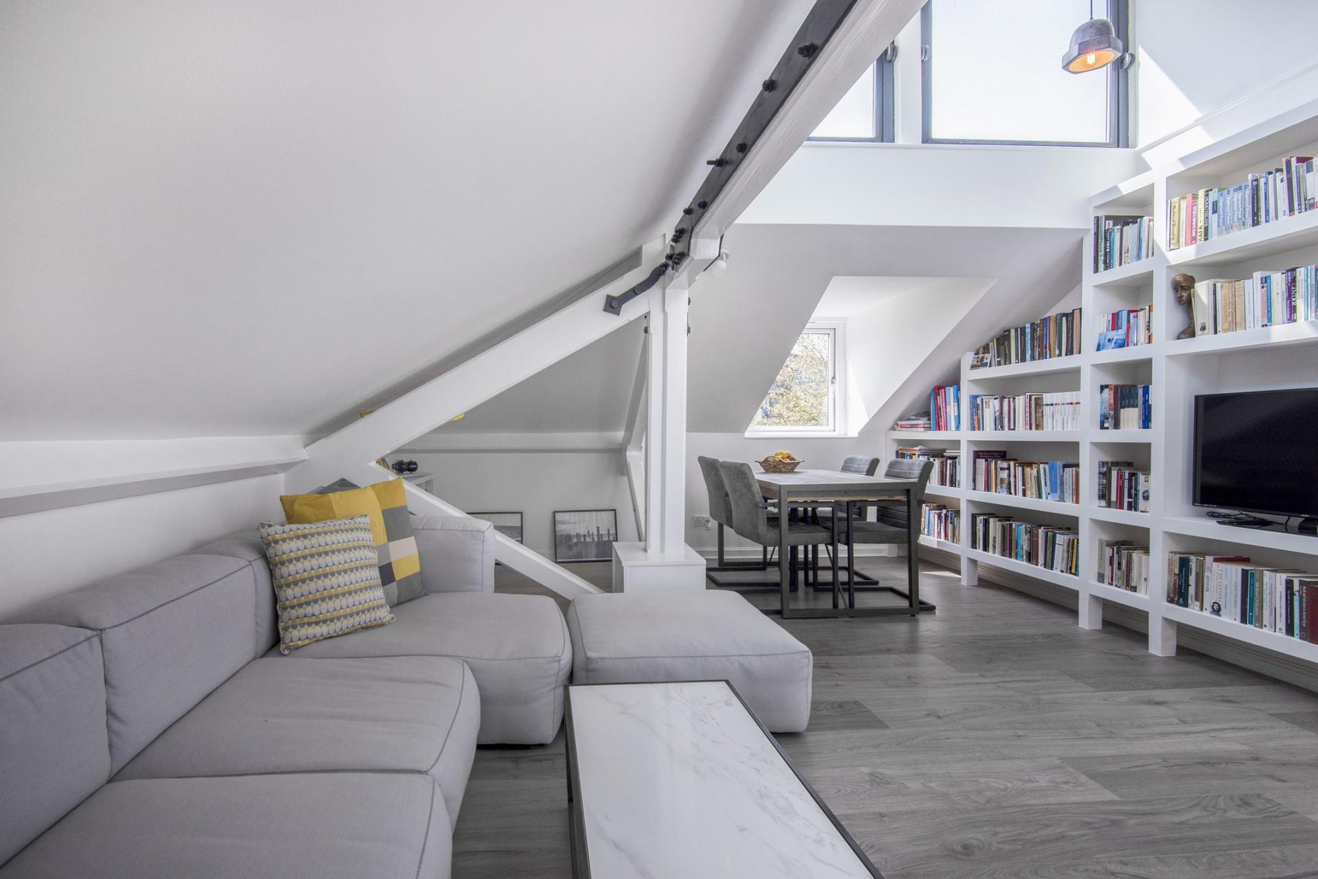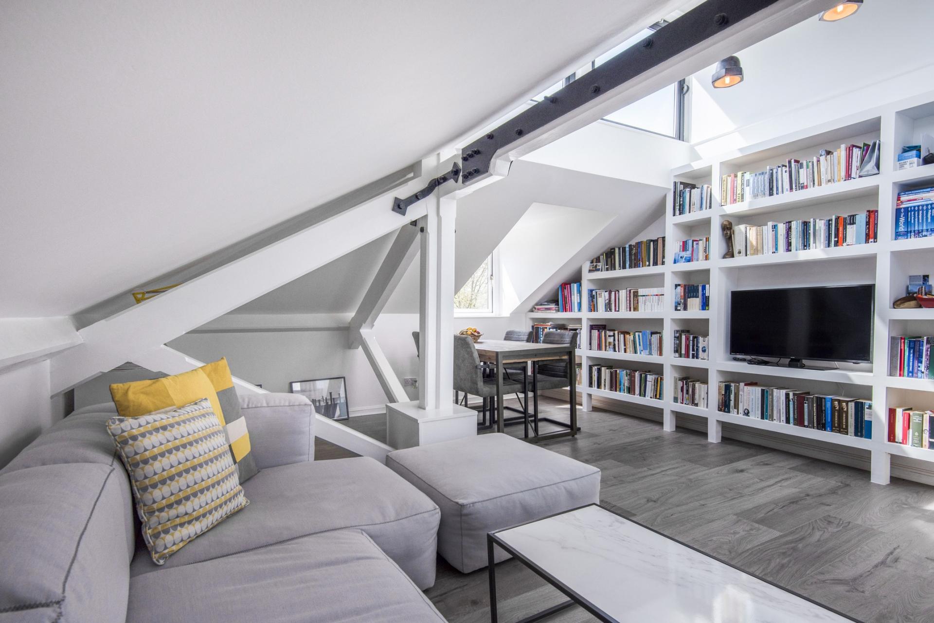 The double sized bedroom, attractively tiled bathroom with window and substantial storage cupboard are on the first floor entrance level. Going up the stairs you enter the main living space with high ceilings, beams with industrial steel features, in-built shelving and 270-degree windows in the upper roof area. The well-finished kitchen has plenty of counter space.