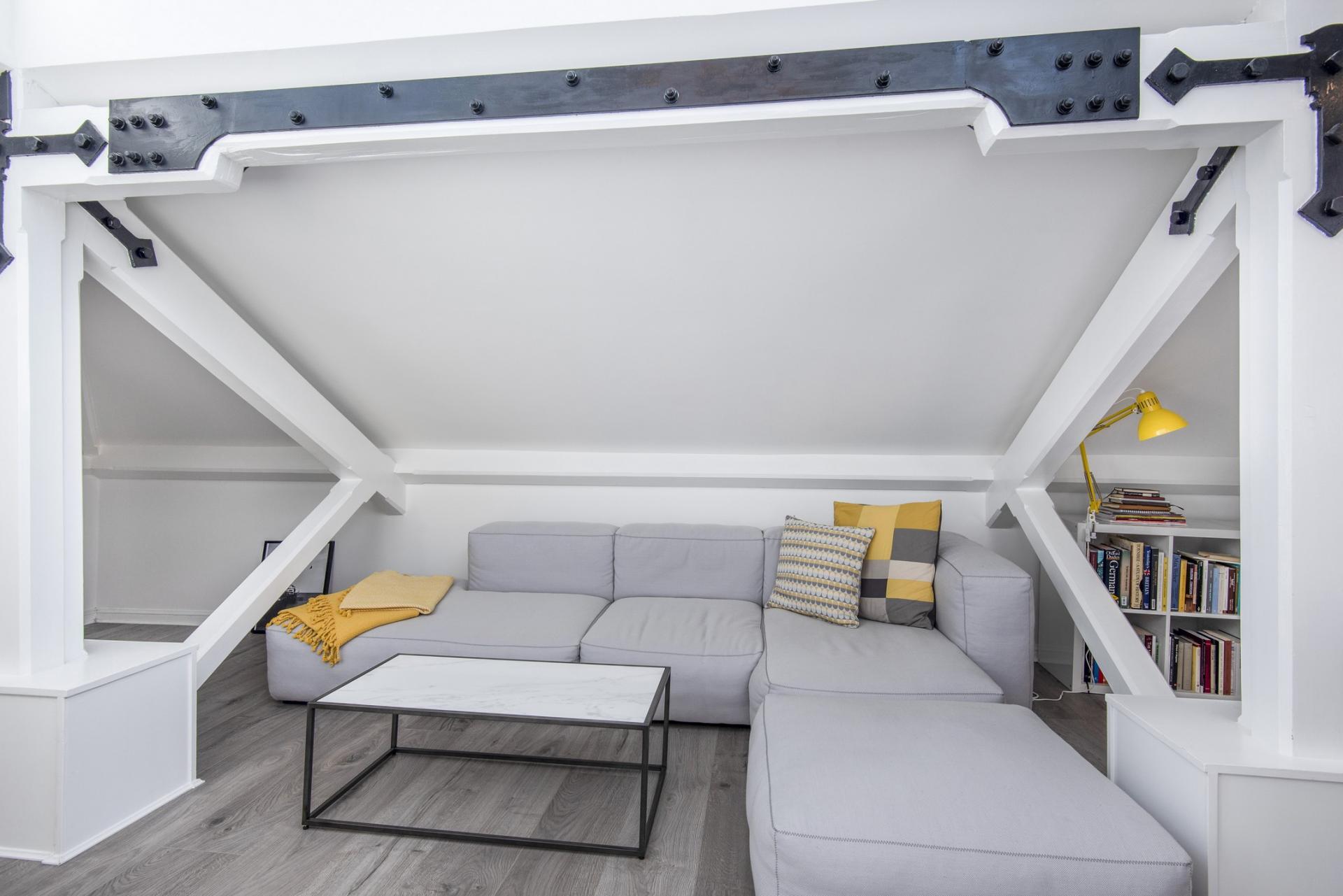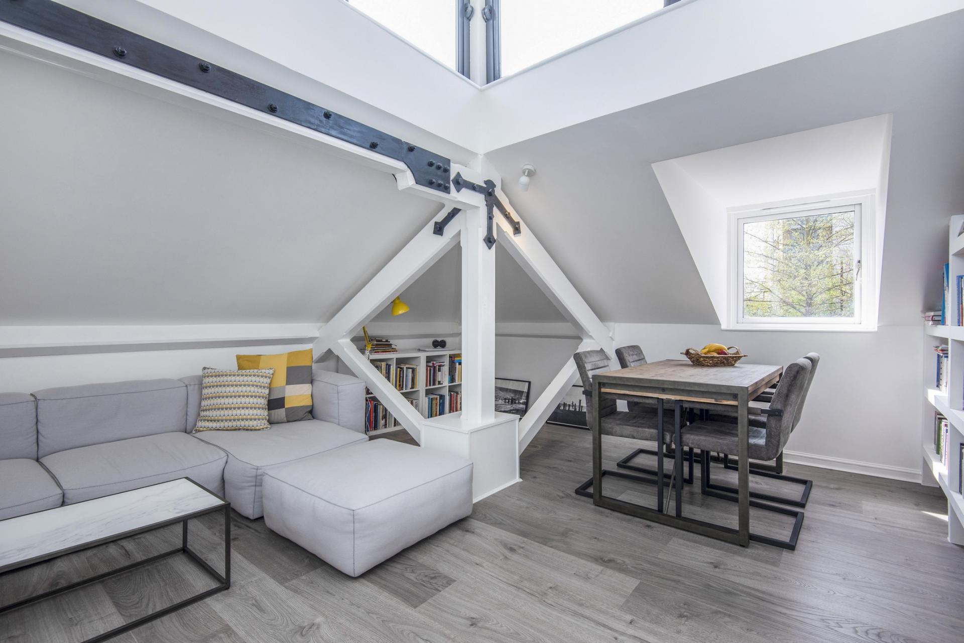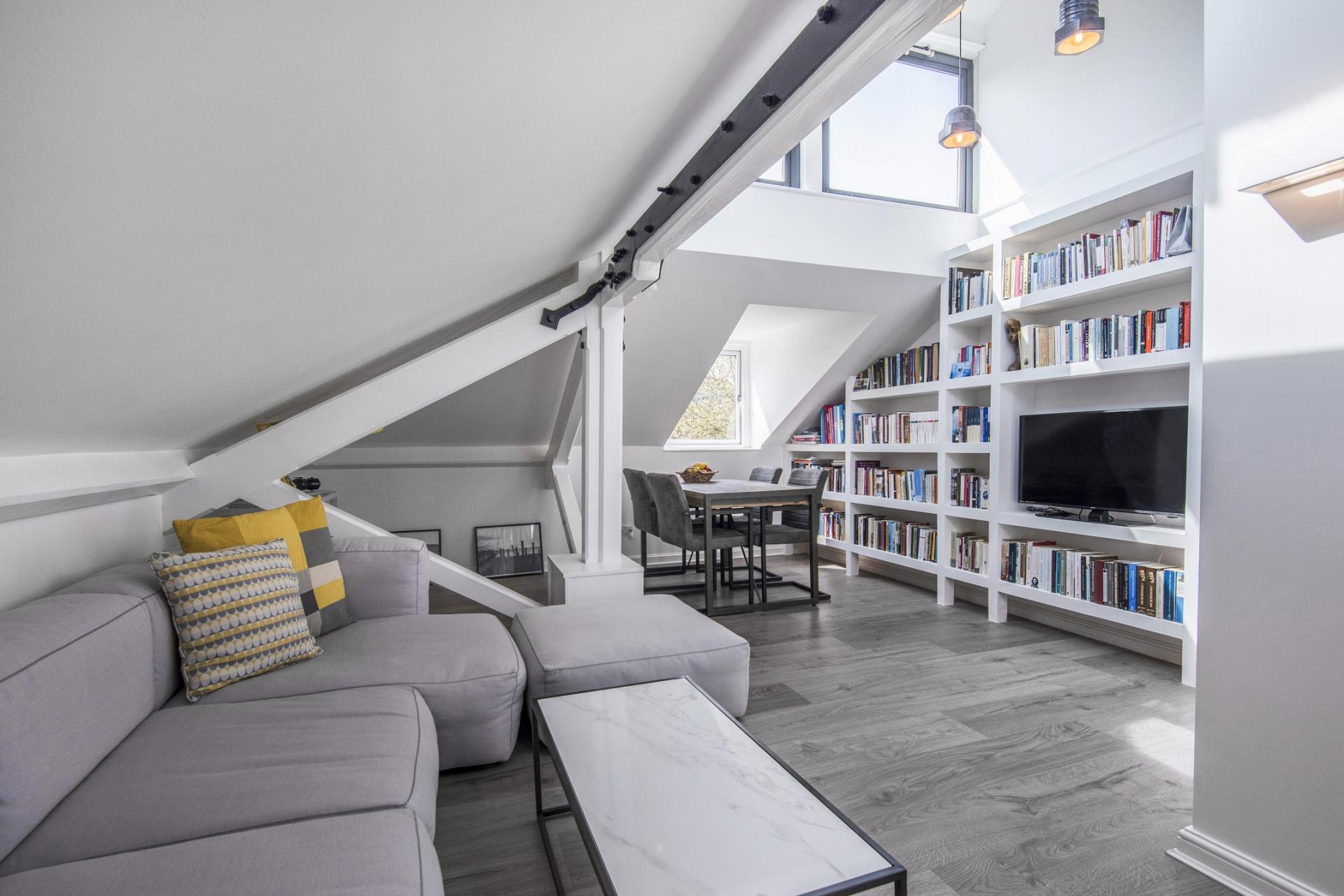 The double sized bedroom, attractively tiled bathroom with window and substantial storage cupboard are on the first floor entrance level. Going up the stairs you enter the main living space with high ceilings, beams with industrial steel features, in-built shelving and 270-degree windows in the upper roof area. The well-finished kitchen has plenty of counter space.
