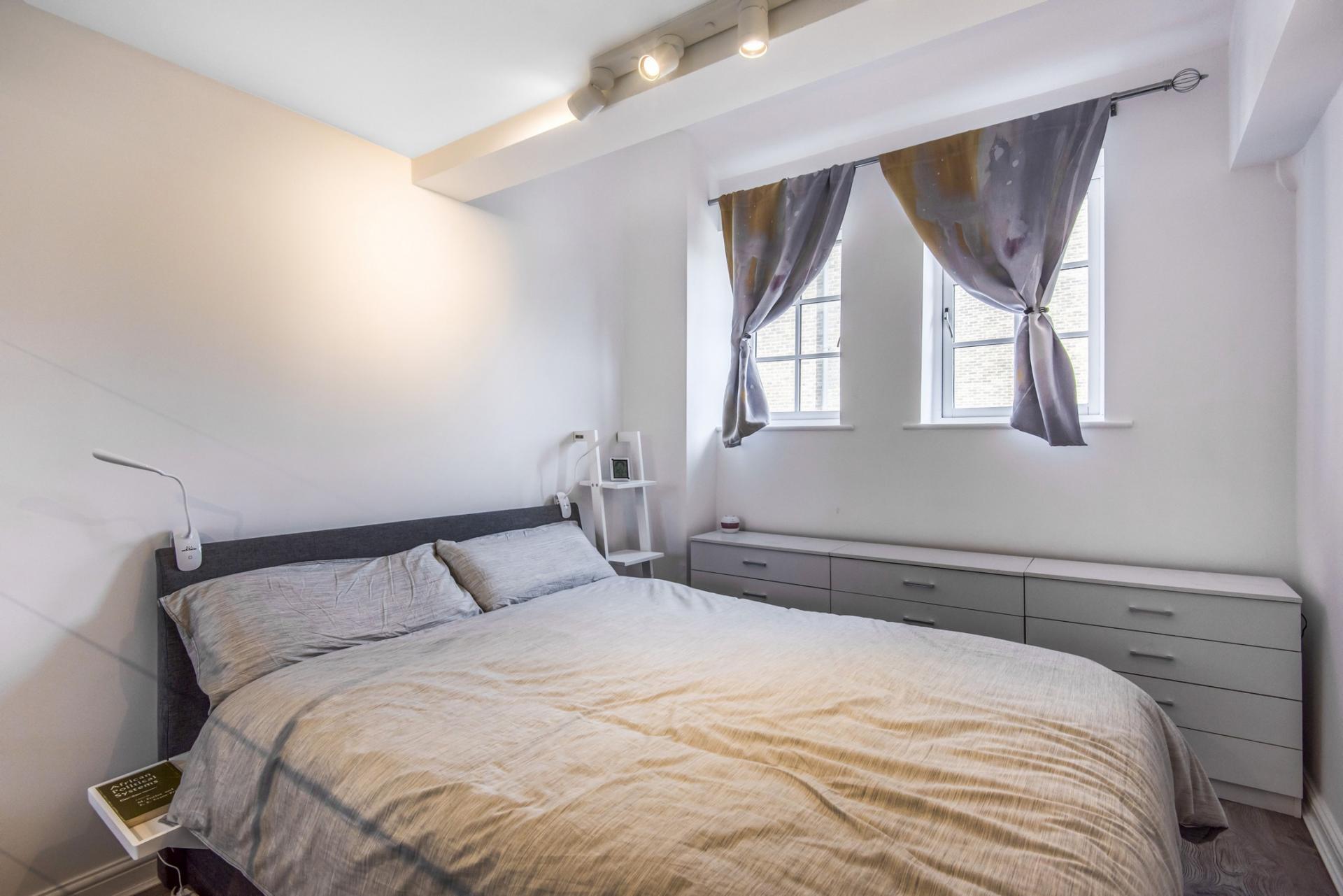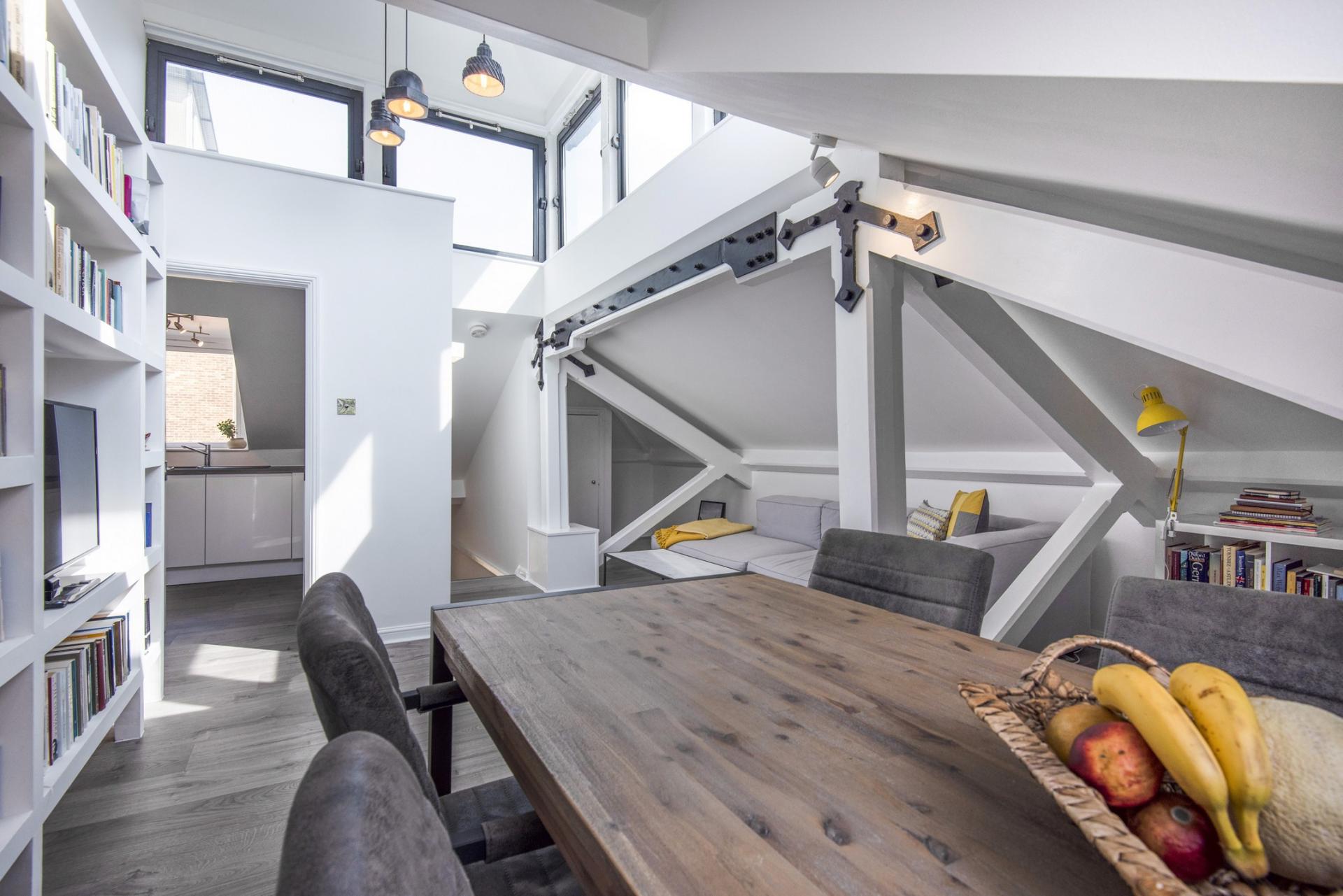 A unique 652sqft split-level apartment close to local amenities and within easy reach of Canada Water and Surrey Quays stations. Fully refurbished to a high standard, a lantern-style roof bathes the living area with natural light. It has allocated parking and a separate kitchen.