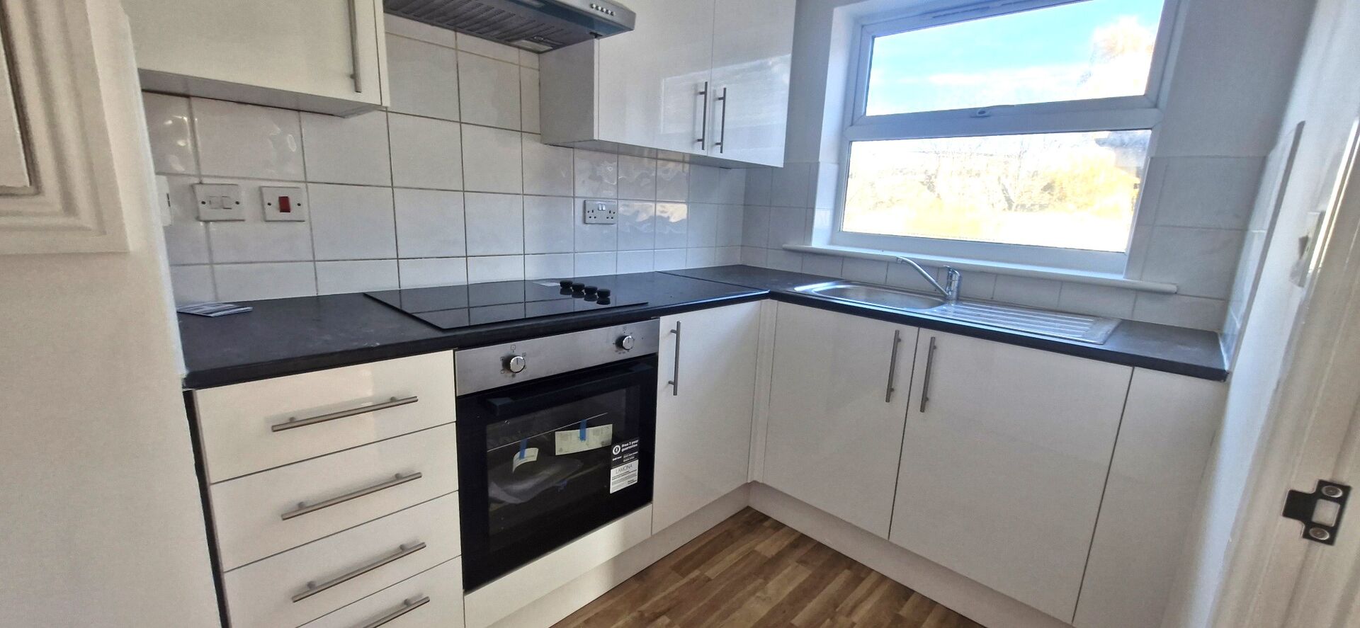 Recently refurbished, the apartment boasts a fresh and contemporary aesthetic,. The modern fitted kitchen is equipped with essential appliances including an oven, hob, fridge/freezer, and washing machine, ensuring convenience for daily living.