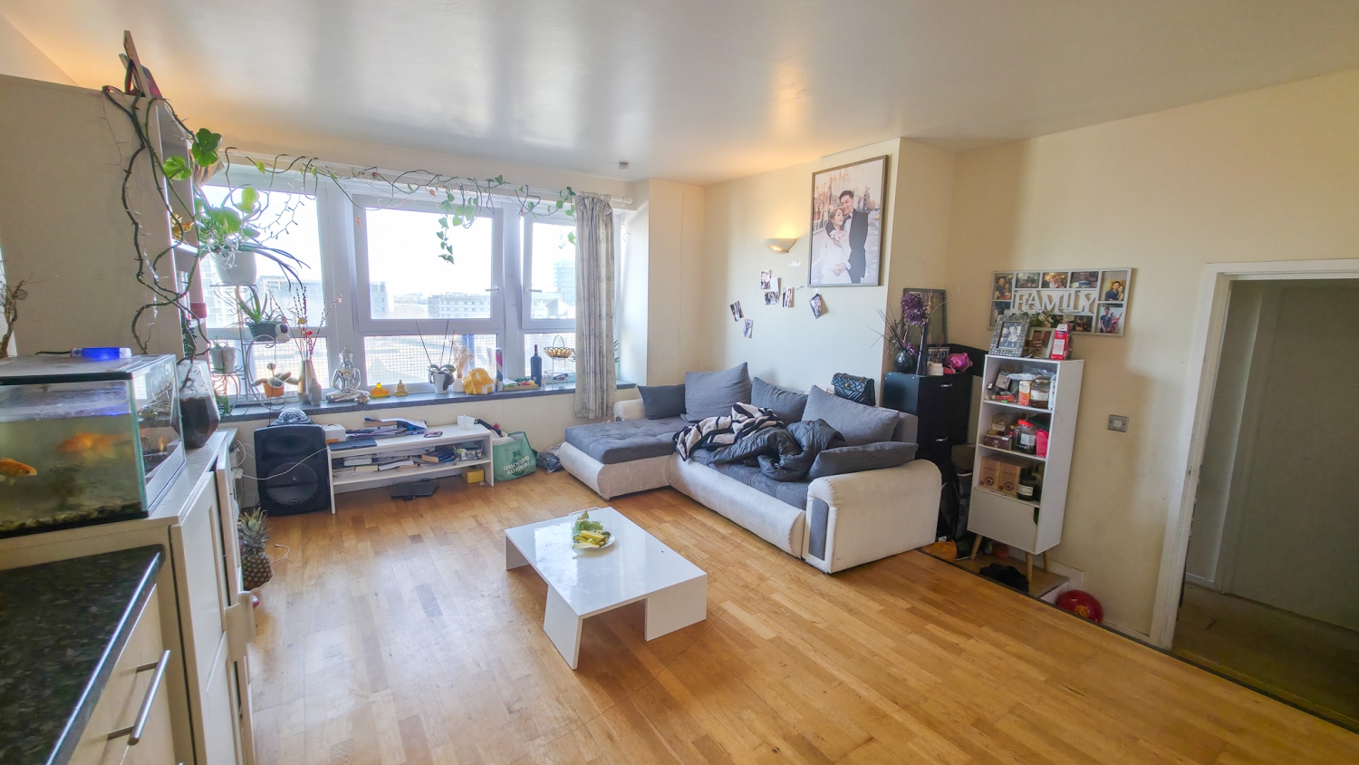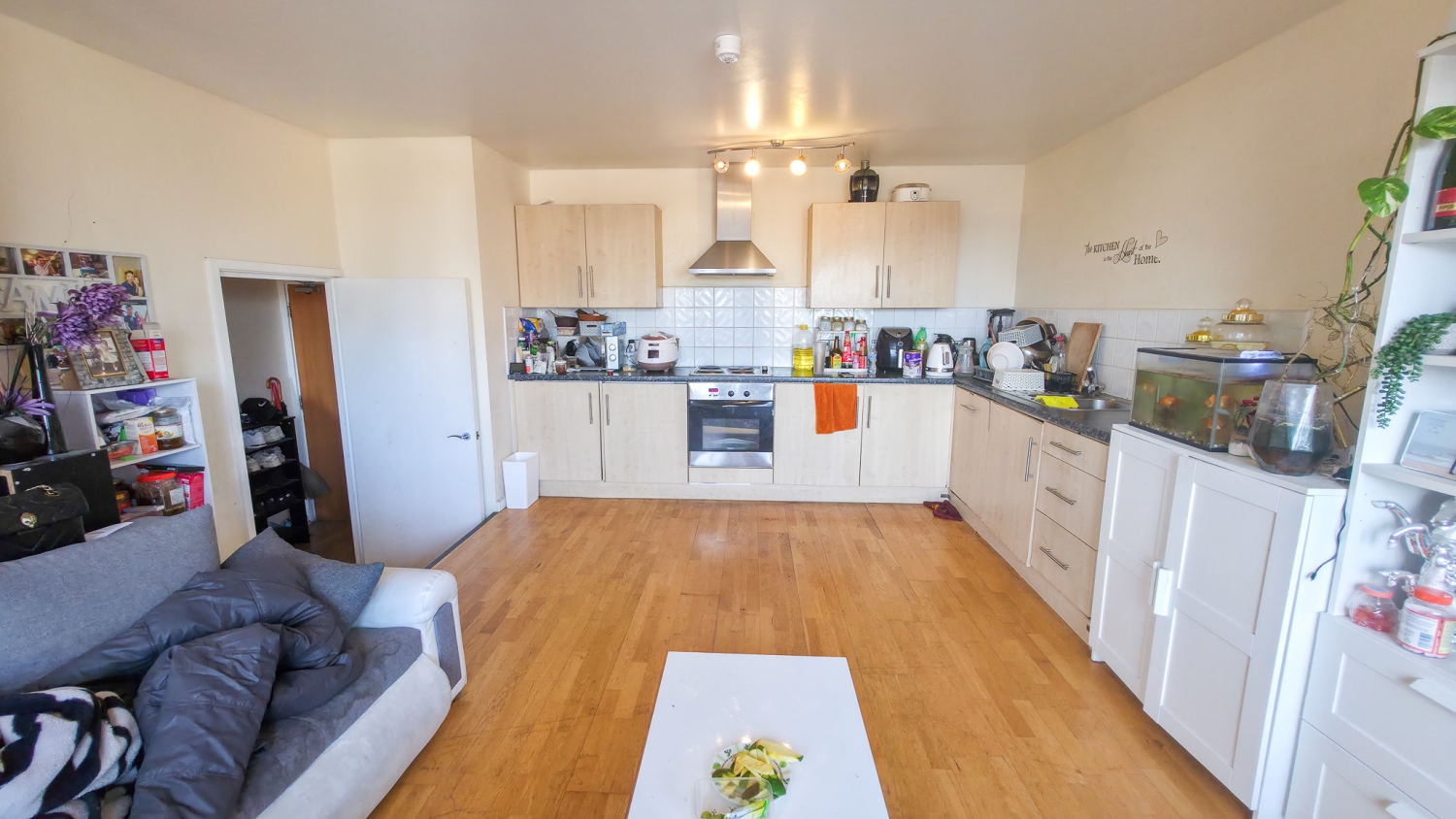 The property boasts impressive high ceilings and a bright open-plan kitchen/reception room, creating a spacious and airy environment ideal for both relaxing and entertaining. The kitchen is finished to a good standard with integrated appliances and ample storage.