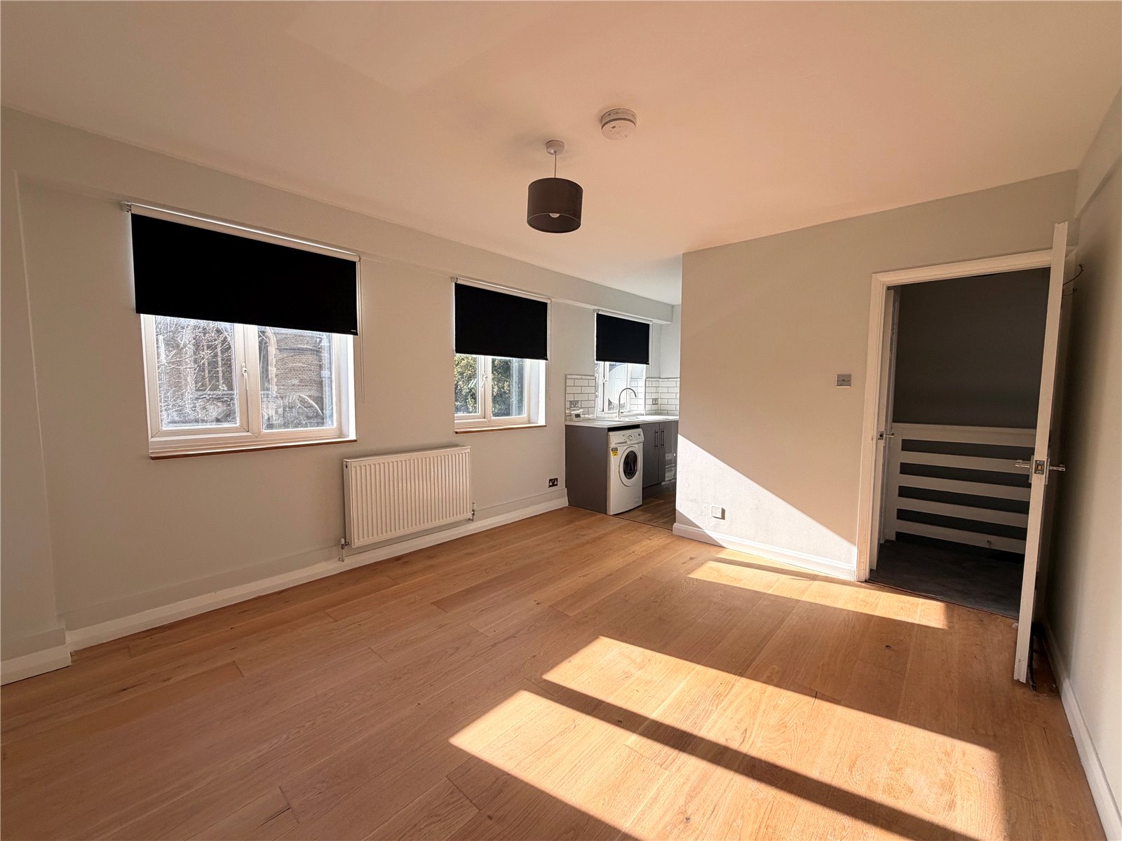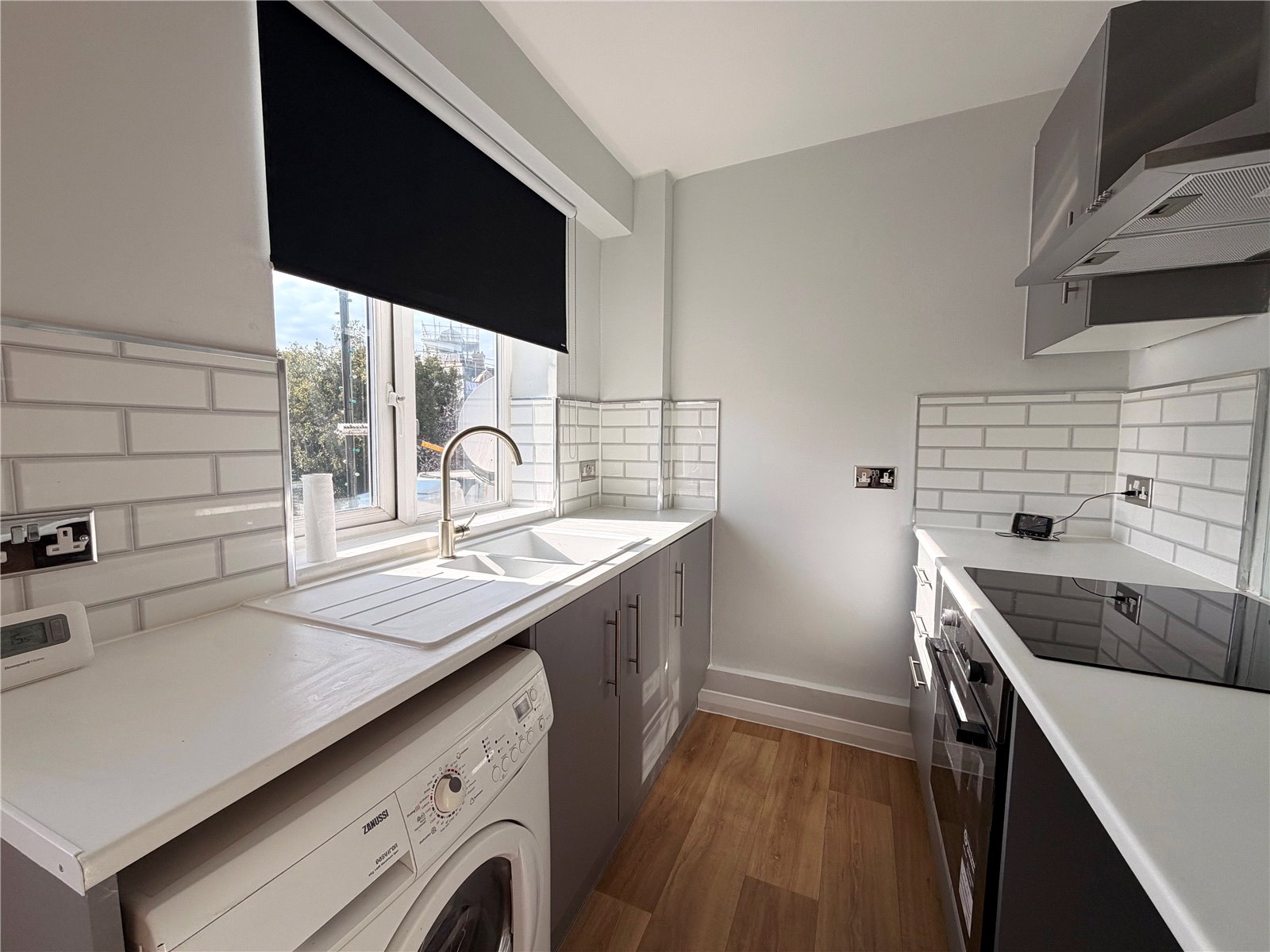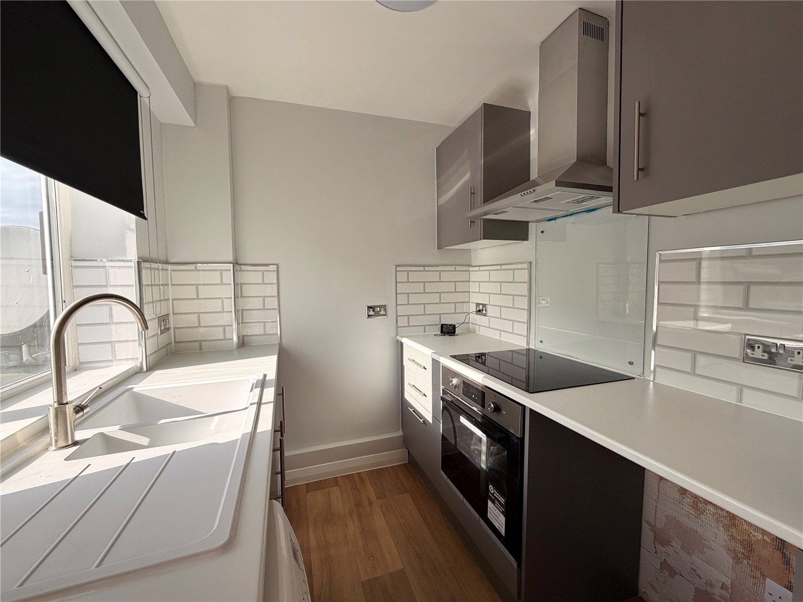 This bright and spacious property offers a well-proportioned open-plan reception room, filled with natural light from multiple windows and finished with attractive wooden flooring throughout. The modern fitted kitchen features contemporary cabinetry, integrated oven and hob, tiled splashbacks and space for appliances.