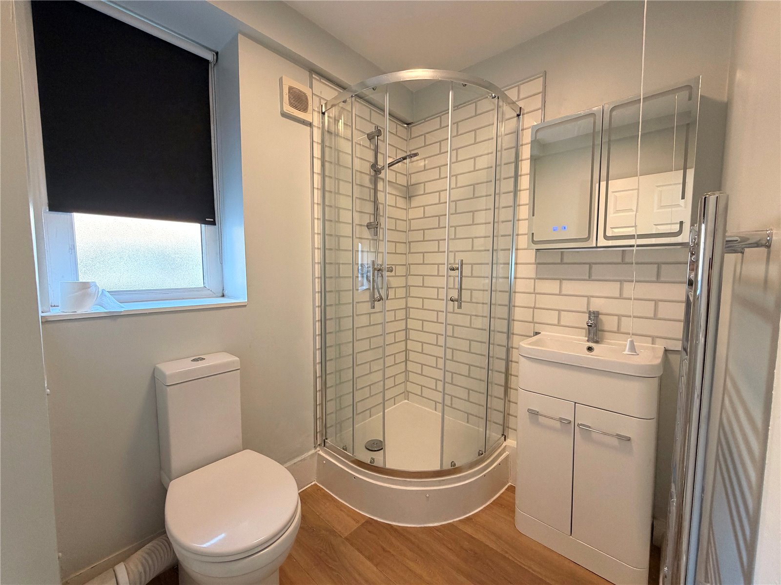 The property comprises a generous double bedroom with built-in wardrobes, providing excellent storage, and a modern shower room with a stylish corner shower, vanity unit and contemporary tiling.