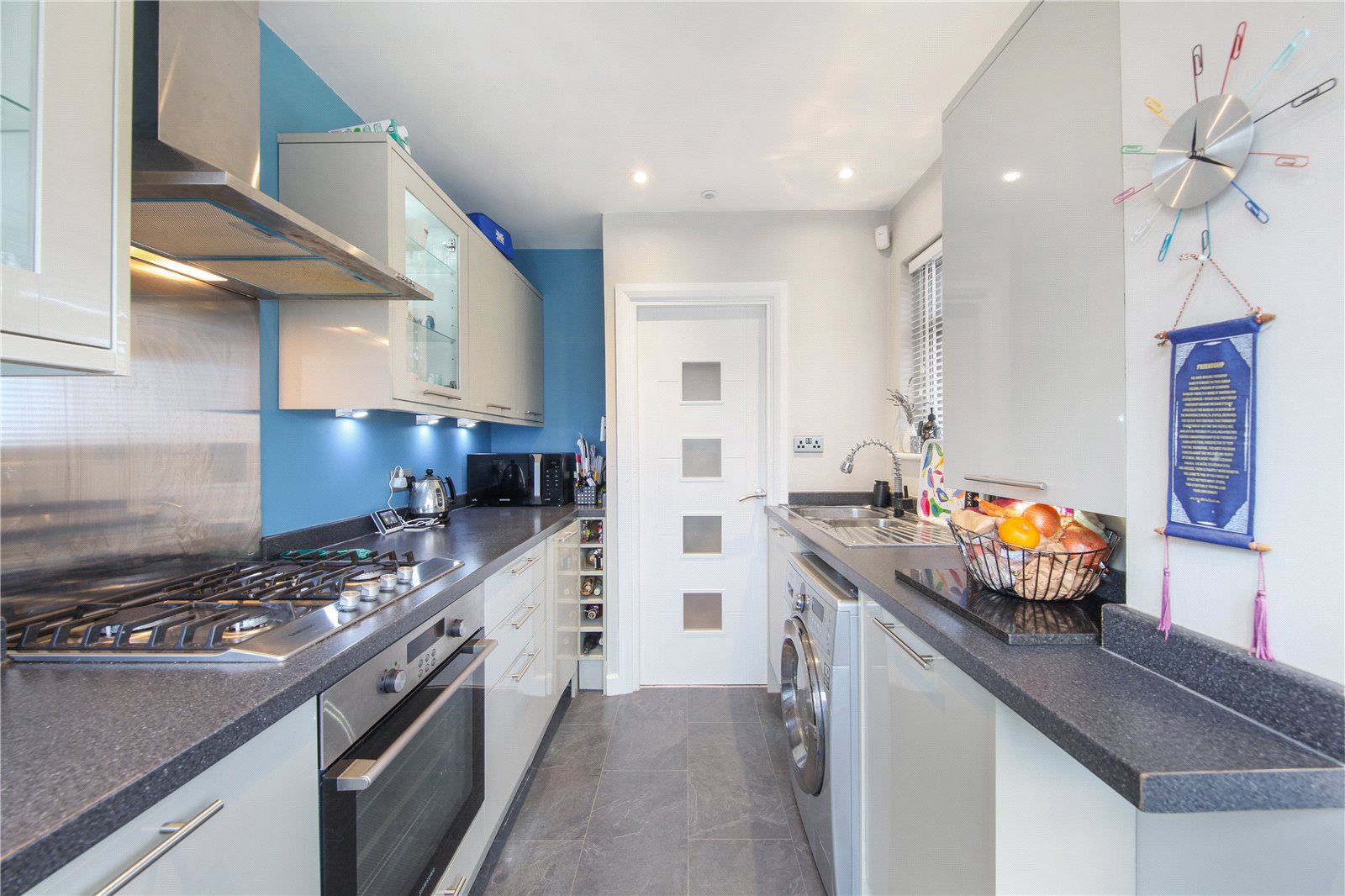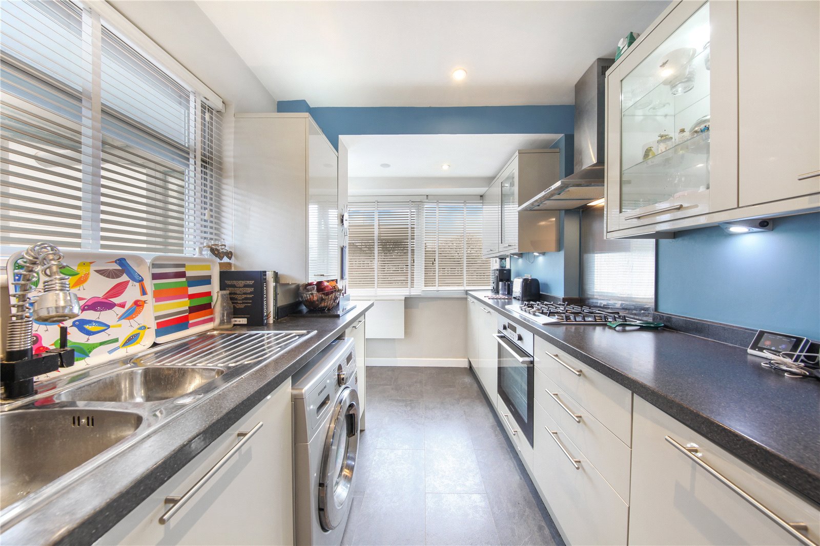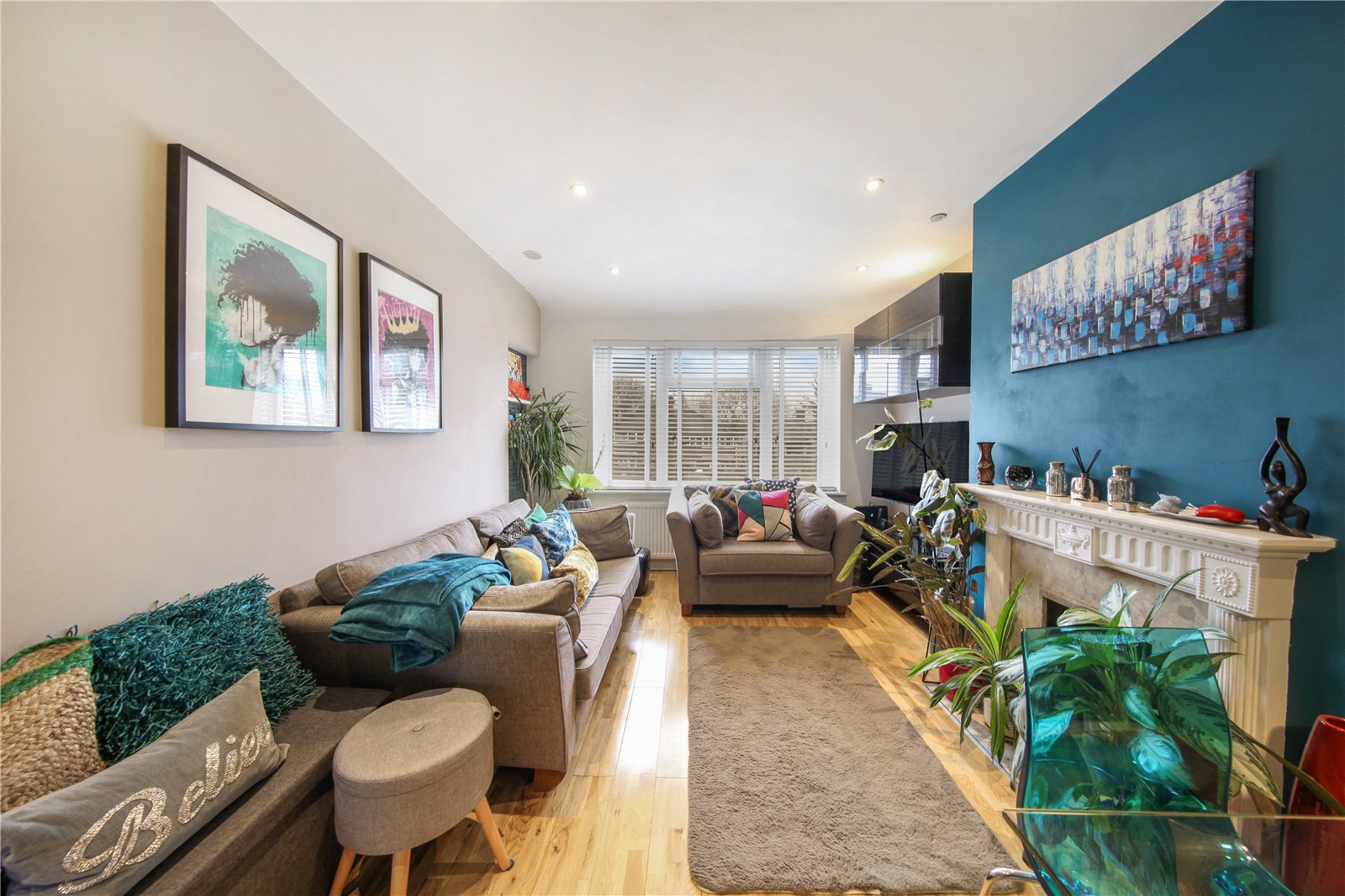 The property offers a bright and generous reception room with a feature fireplace and modern décor, seamlessly arranged to accommodate both lounge and dining areas. The separate, fully fitted kitchen is sleek and modern, complete with integrated appliances, excellent storage and ample worktop space.