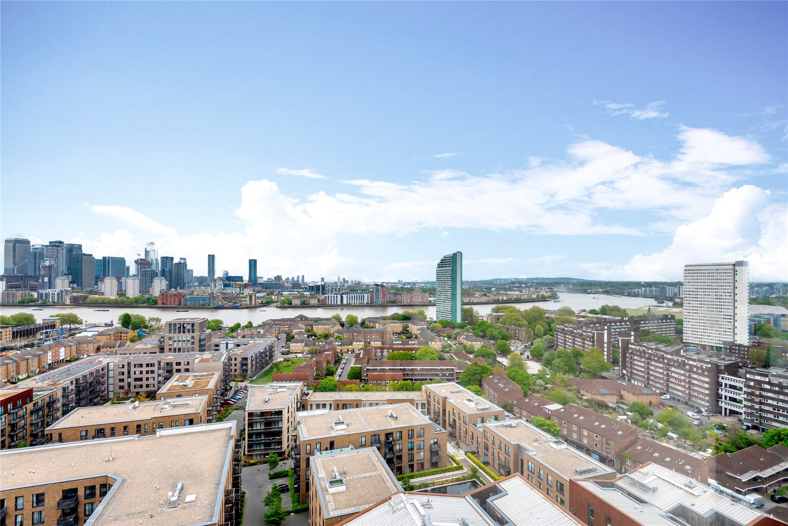 This vast and bright 18th floor home has several standout features including the river-facing 37ft living area with open-plan kitchen and the dual-aspect city-facing master bedroom, in conjunction with a space ideal for a home office and a stunning ensuite with separate bath and walk-in shower. The second spacious bedroom offering views towards Greenwich is located at the opposite side of the property and there are two bathrooms as well as a further separate WC.