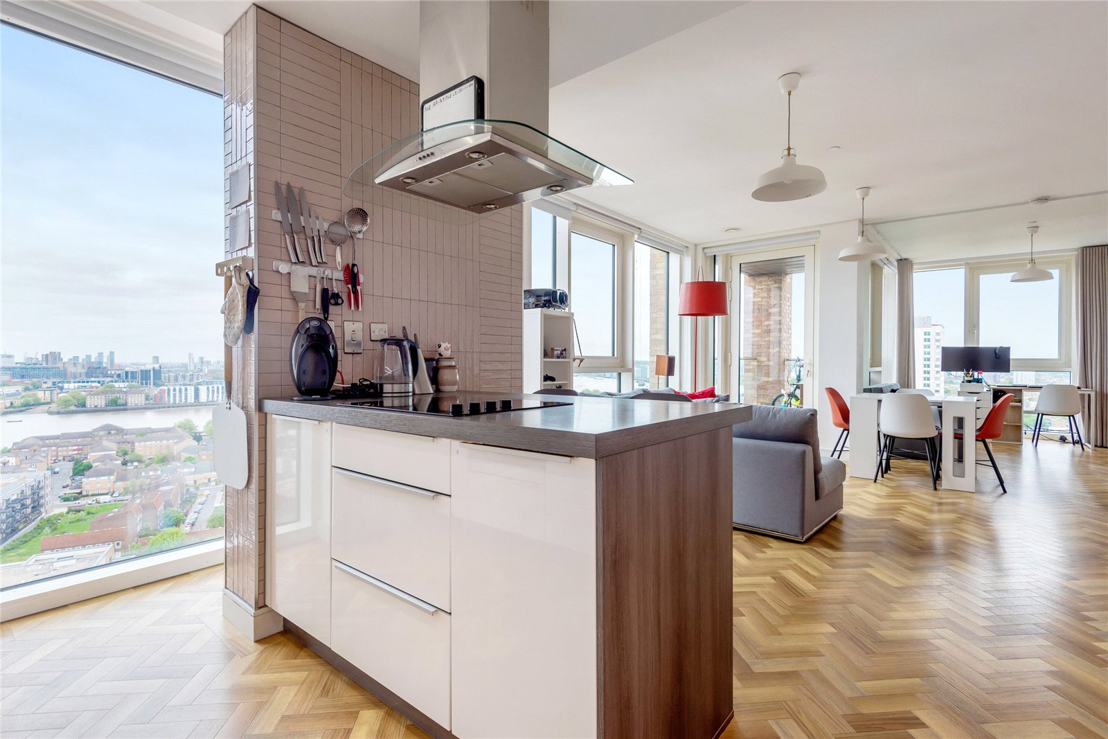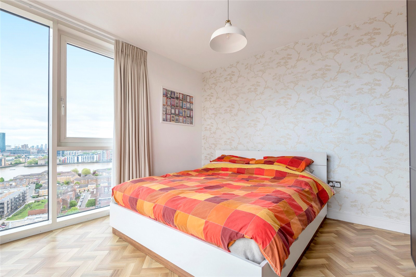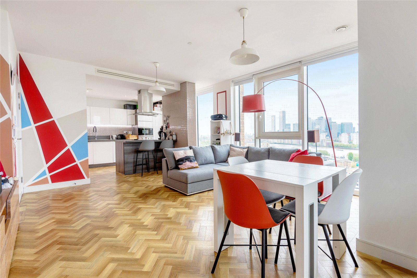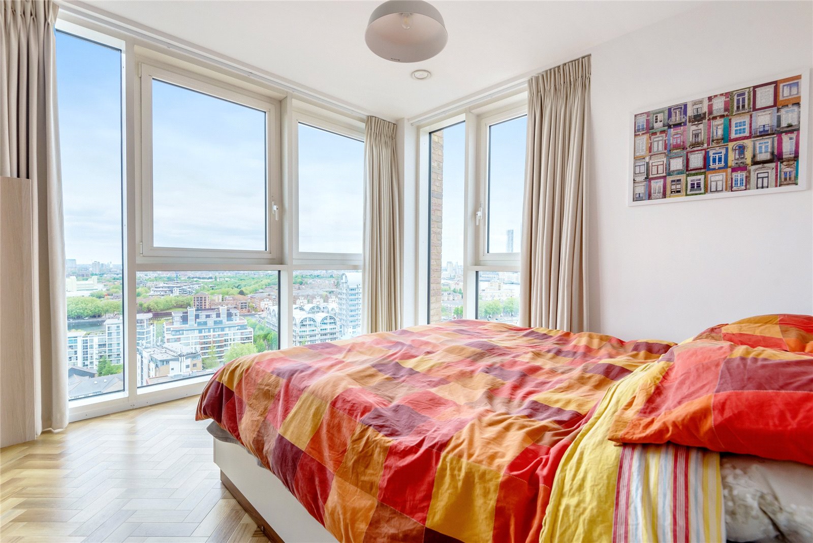 A triple-aspect 1139sqft sub-penthouse apartment boasting spectacular views across London. It has floor-to-ceiling windows, air-conditioning, secure allocated parking, a balcony, heated parquet flooring, and use of the gated podium garden, onsite 24-hour concierge and residents' gym.