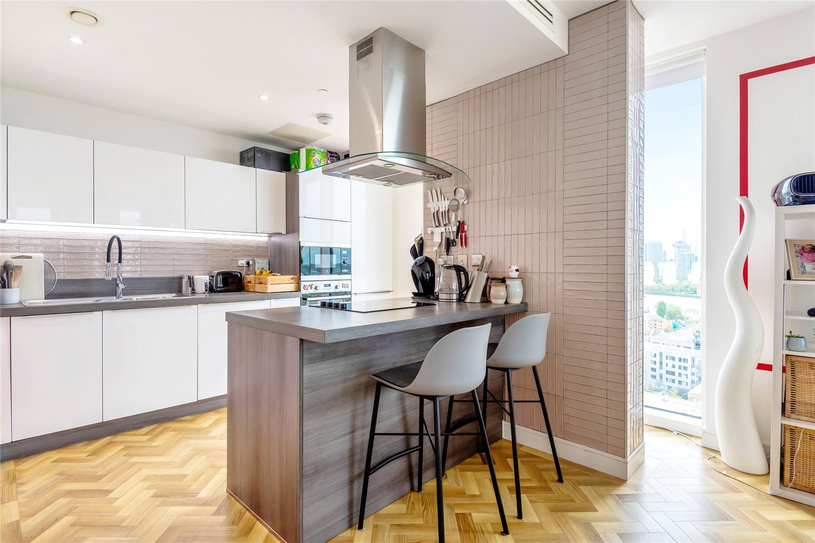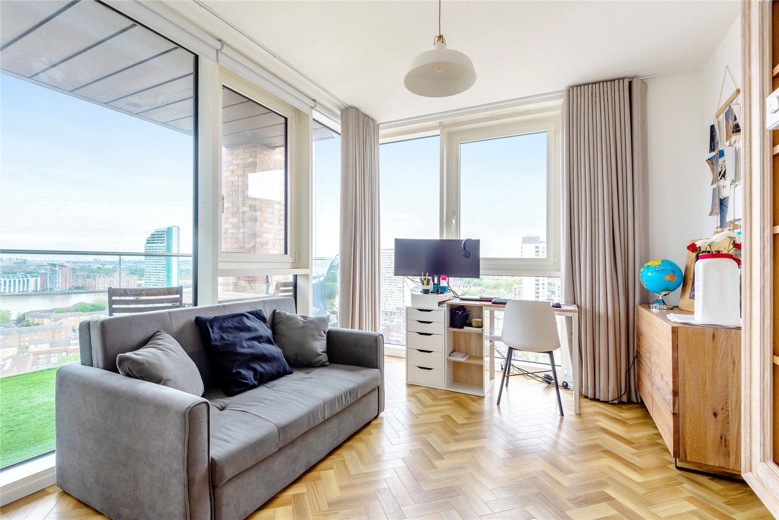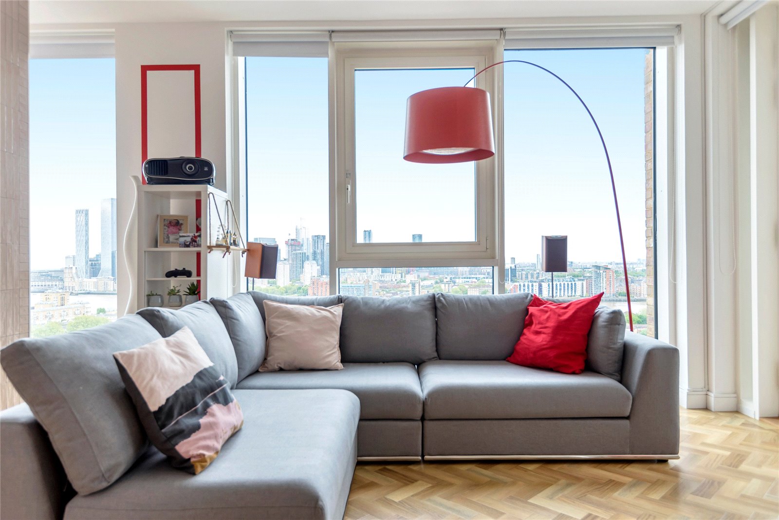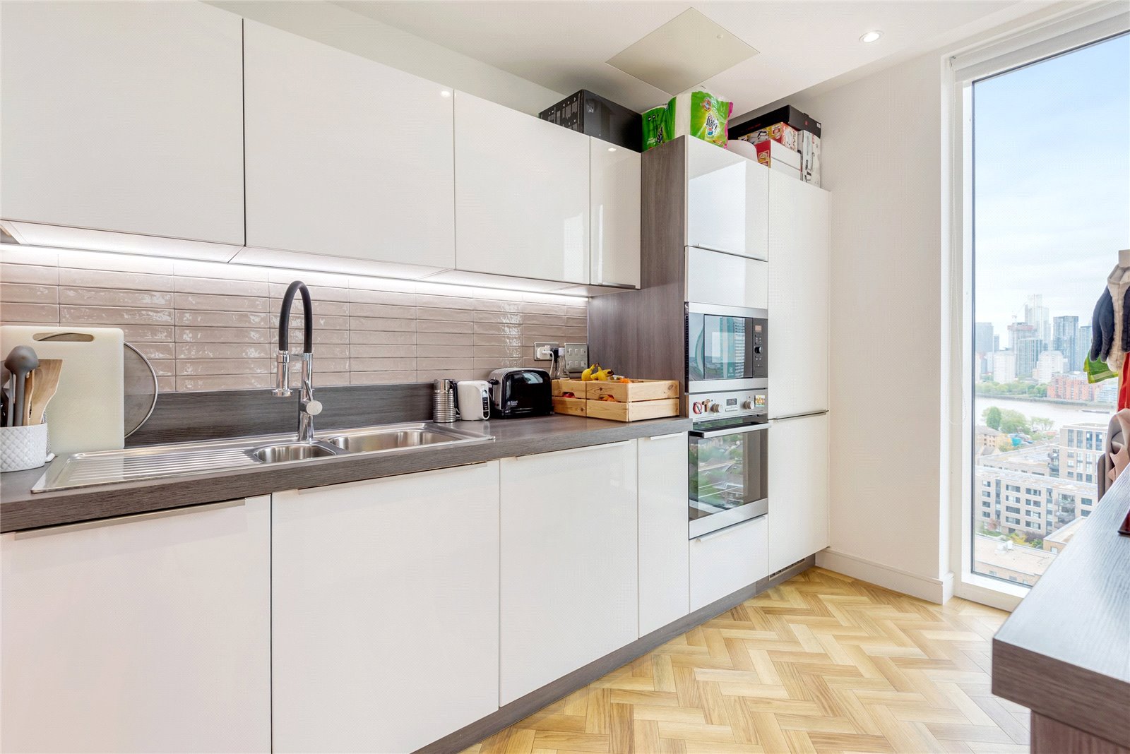 A triple-aspect 1139sqft sub-penthouse apartment boasting spectacular views across London. It has floor-to-ceiling windows, air-conditioning, secure allocated parking, a balcony, heated parquet flooring, and use of the gated podium garden, onsite 24-hour concierge and residents' gym.