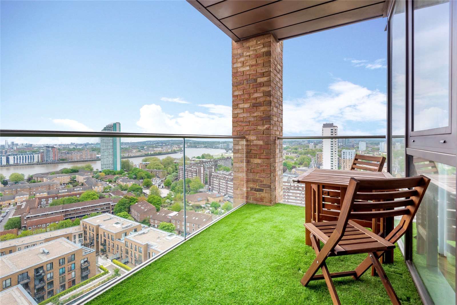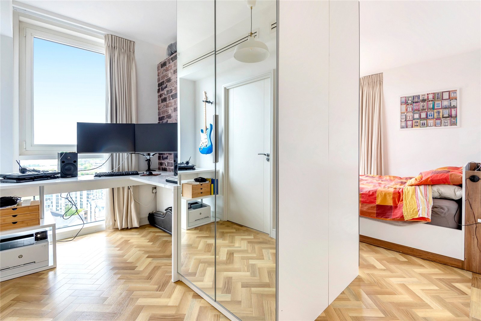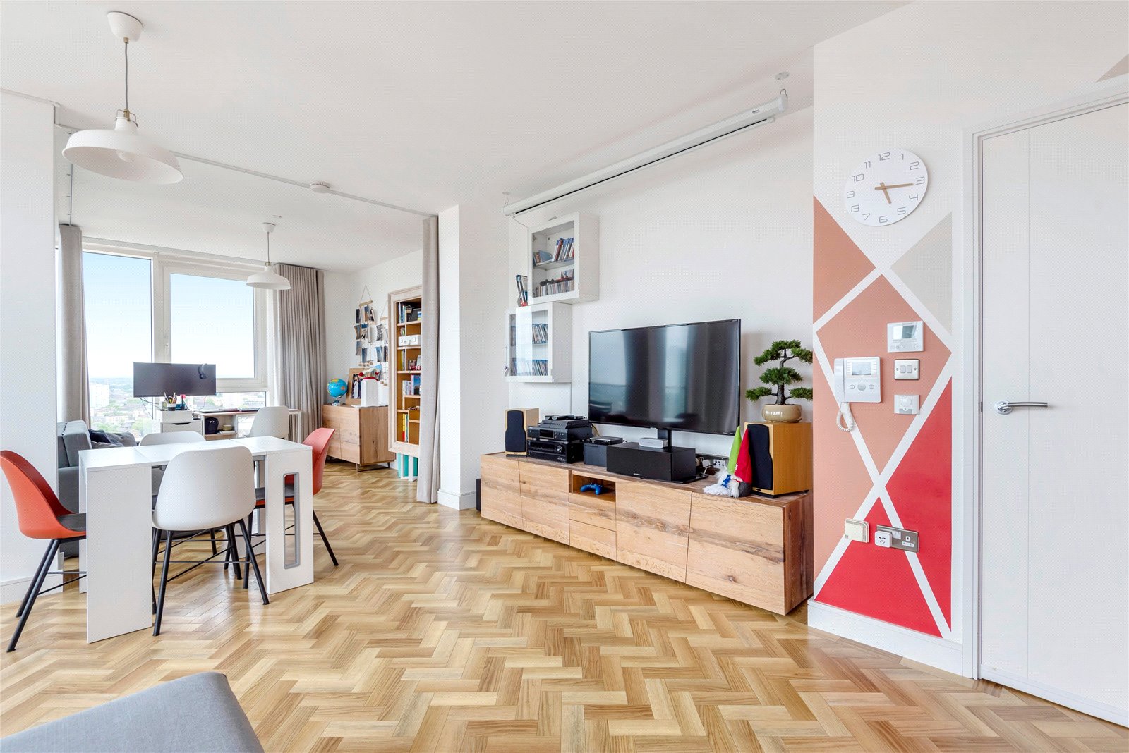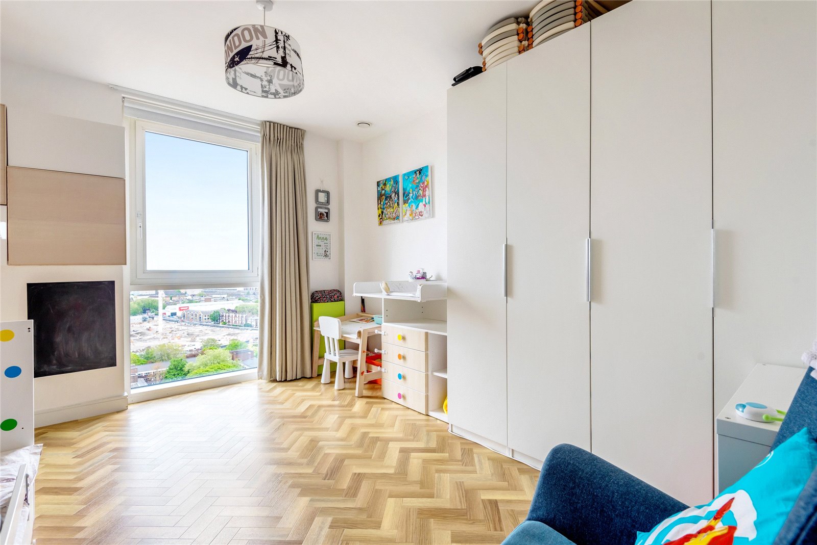 A triple-aspect 1139sqft sub-penthouse apartment boasting spectacular views across London. It has floor-to-ceiling windows, air-conditioning, secure allocated parking, a balcony, heated parquet flooring, and use of the gated podium garden, onsite 24-hour concierge and residents' gym.