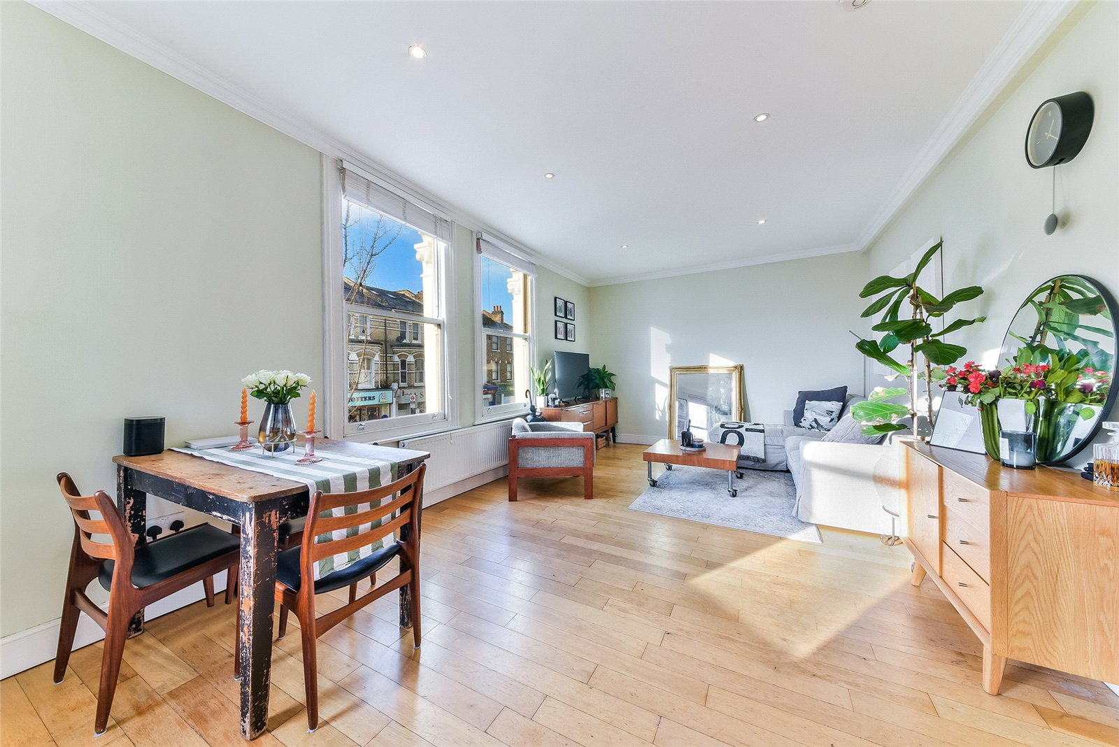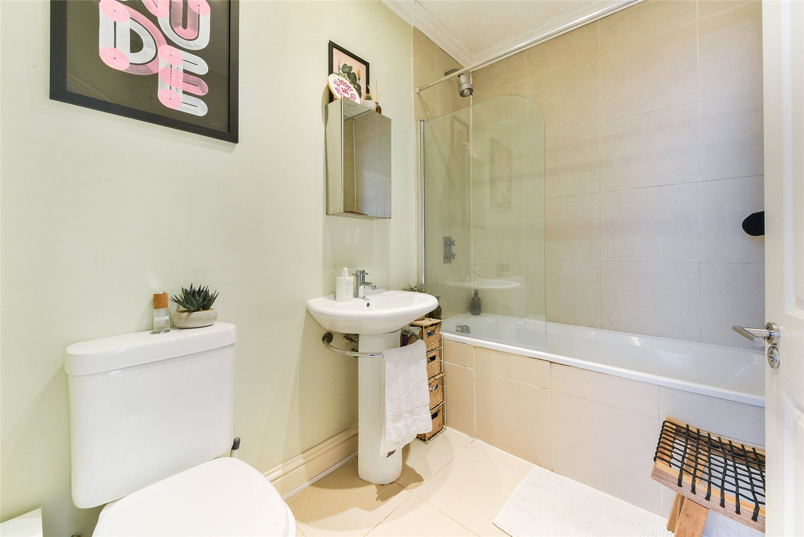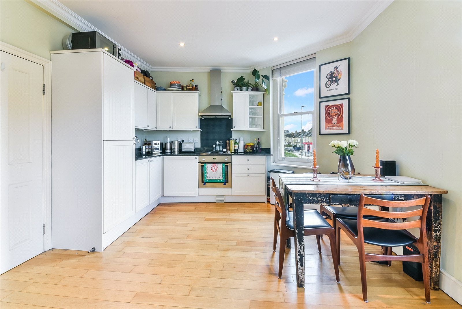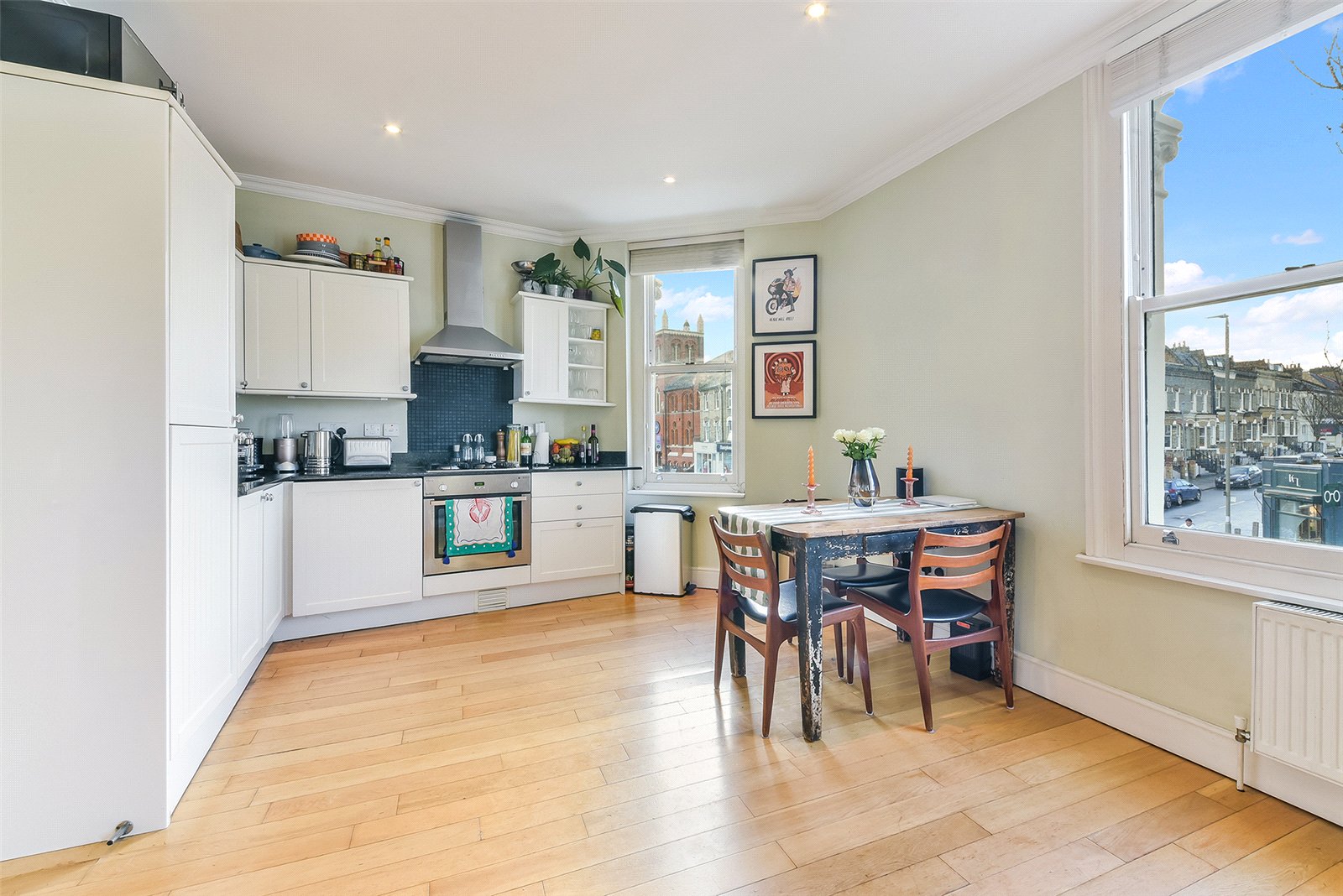 The apartment itself features a bright and spacious open plan kitchen and living area, enhanced by attractive wood floors and tasteful neutral décor throughout. The modern kitchen comes fully fitted with ample storage and worktop space. A highlight of this property is the master bedroom, which opens directly onto a private decked terrace. There is also a contemporary bathroom fitted with a sleek shower, alongside a second well-proportioned double bedroom, providing flexible accommodation for a family or professional sharers.