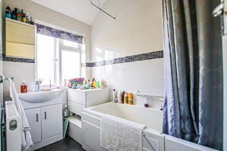 7' 9" x 4' 10" (2.36m x 1.47m) White bathroom suite with panel enclosed bath mixer taps and shower attachment, wash hand basin with mixer tap, rear aspect frosted double glazed window.