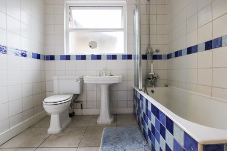 9' 3" x 8' 0" (2.82m x 2.44m) White bathroom suite with panel enclosed bath mixer taps and shower attachment, pedestal wash hand basin, close coupled W.C., side aspect frosted double glazed window. NB: The shower cubicle is not usable.