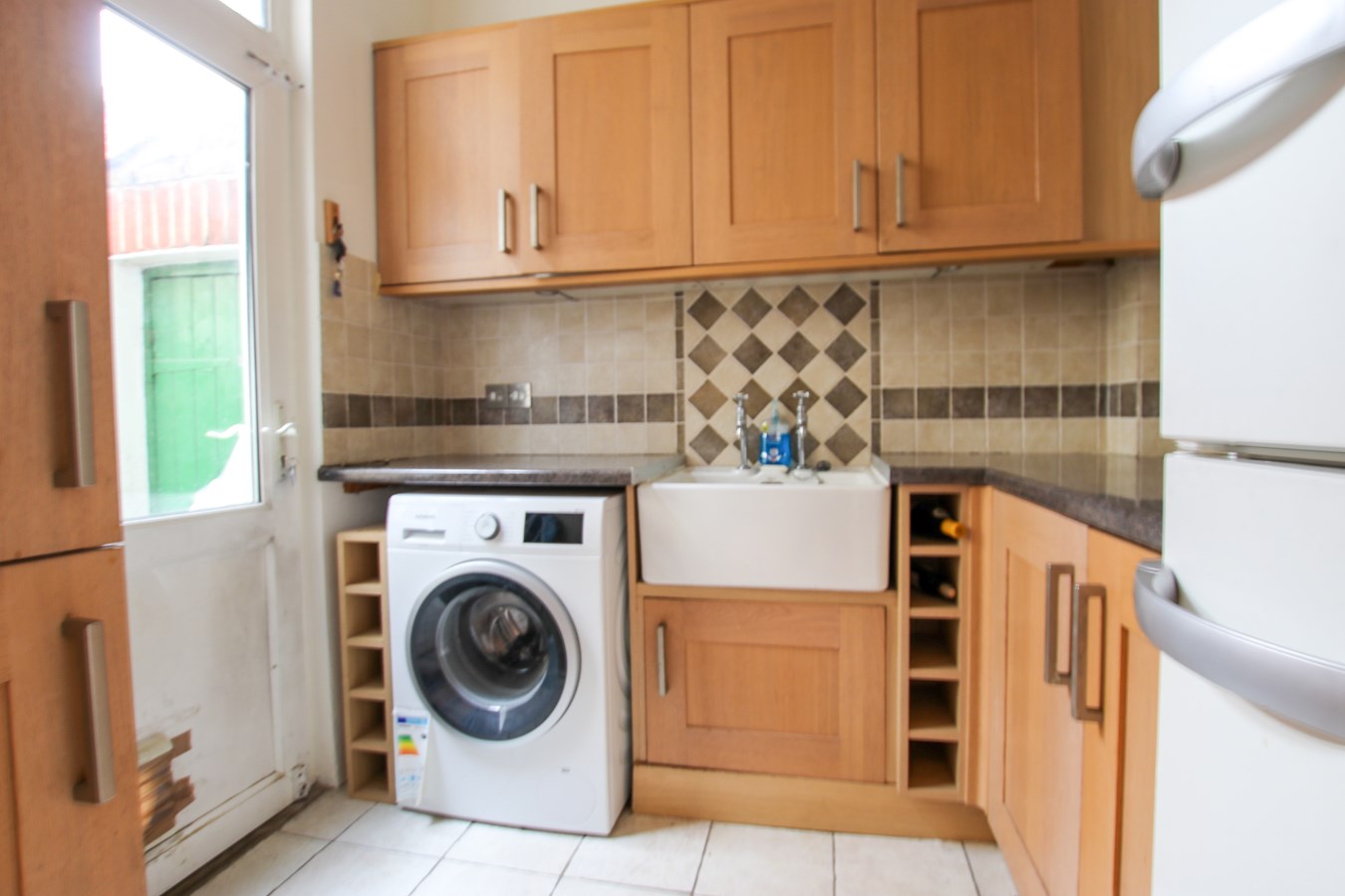 7' 6" x 6' 10" (2.29m x 2.08m) Matching wall and base units with butler sink, washing machine, Miele fridge freezer, side aspect double glazed door.