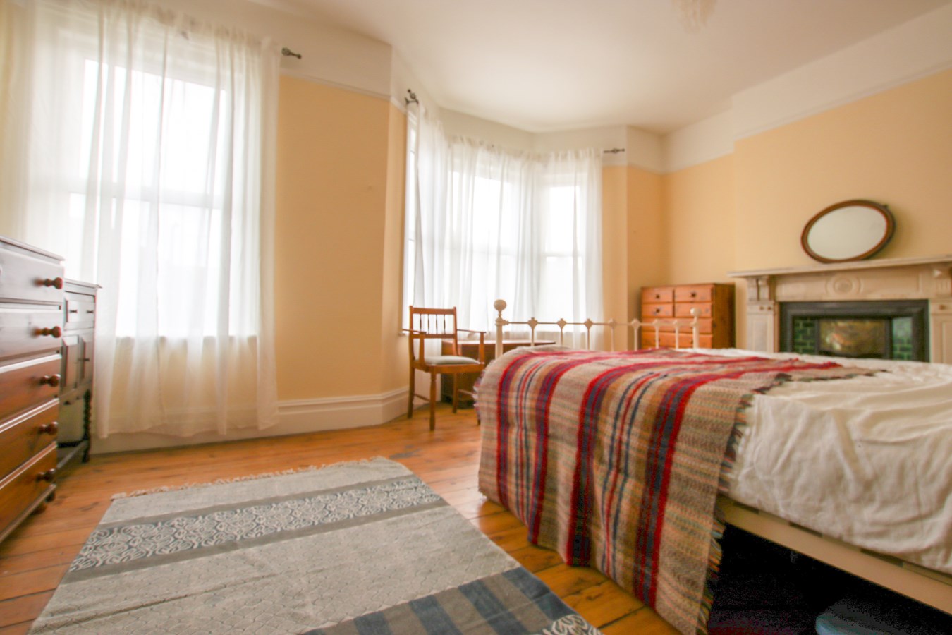14' 8" x 12' 4" (4.47m x 3.76m) Varnished wood flooring, feature fire place (not for use), front aspect double glazed bay window.