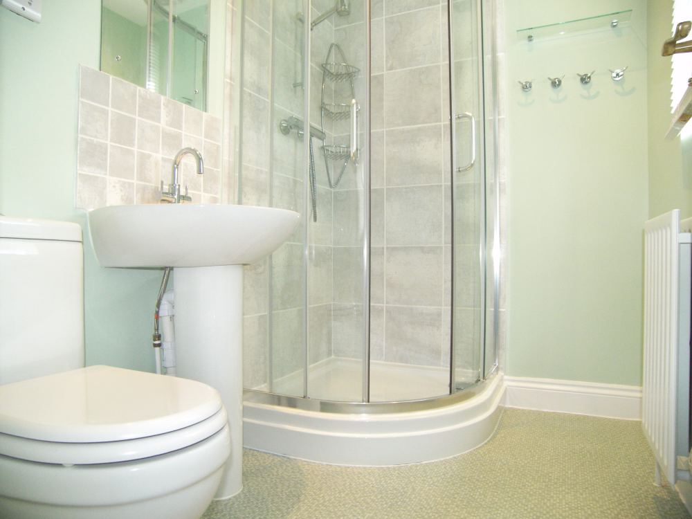 Double glazed window to front, Inset spot lights, double radiator,extractor fan, electric shaving point, three piece white suite comprising low level WC, pedestal wash hand basin, fully enclosed translucent shower cubicle.