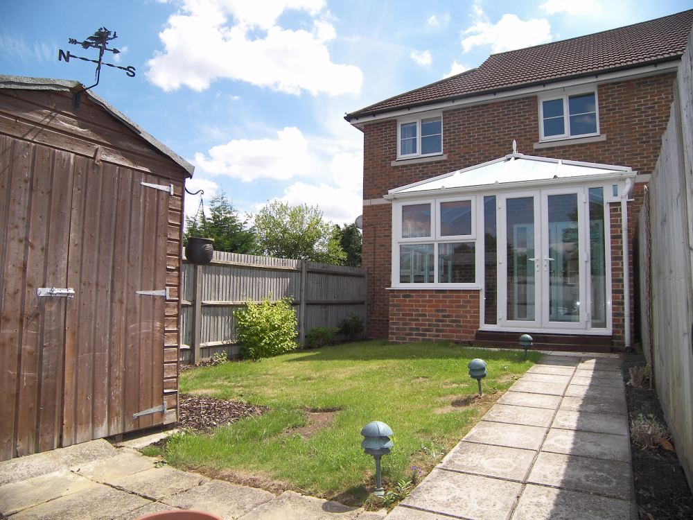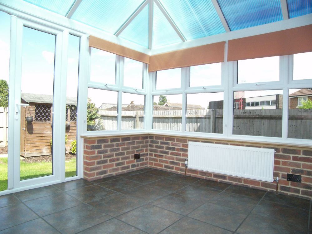 10' 2" x 10' (3.10m x 3.05m) Triple aspect with double glazed window to both sides and to rear, tiled floor, double glazed double doors to garden, double radiator.