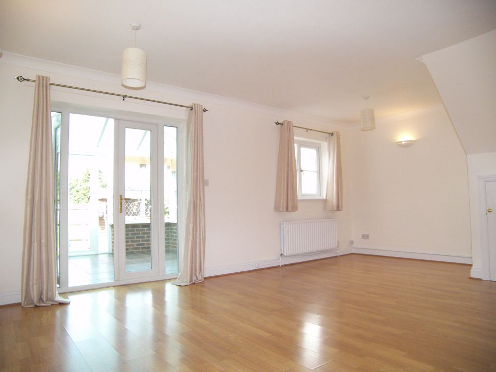 18' 3" x 14' narrowing to 112" (5.56m x 4.27m) Wood effect flooring, two double radiators, double glazed window to rear, storage cupboard, open plan to kitchen, double glazed double doors to conservatory.