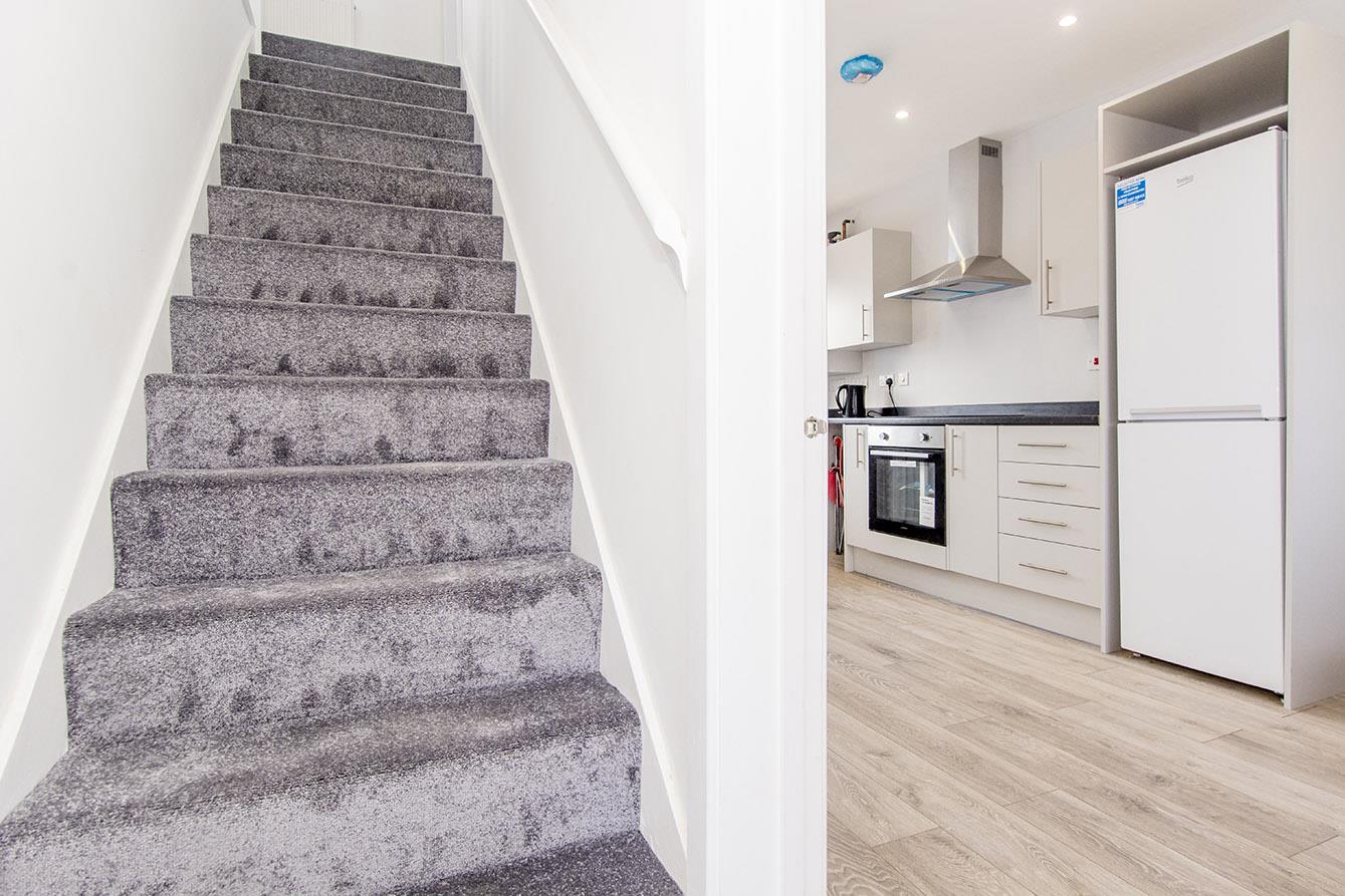 Dining Kitchen - 4.80m x 2.57m (15'9 x 8'5) - The kitchen is fitted with a range of brand new modern cabinets with complimenting work surfaces, built in electric oven, ceramic hob with extractor hood, fridge freezer and there is space for a washing machine. There is a window to the front and rear aspect also a double glazed back door. You will find a wall mounted TV point with power socket, laminate flooring and a radiator.