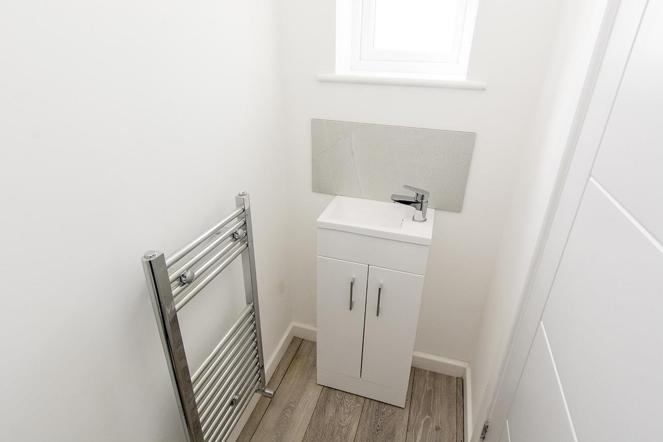 Cloakroom - 2.01m x 0.84m (6'7 x 2'9) - Fitted with a modern low flush WC, hand wash basin set on a vanity unit, radiator, laminate flooring and an extractor fan.