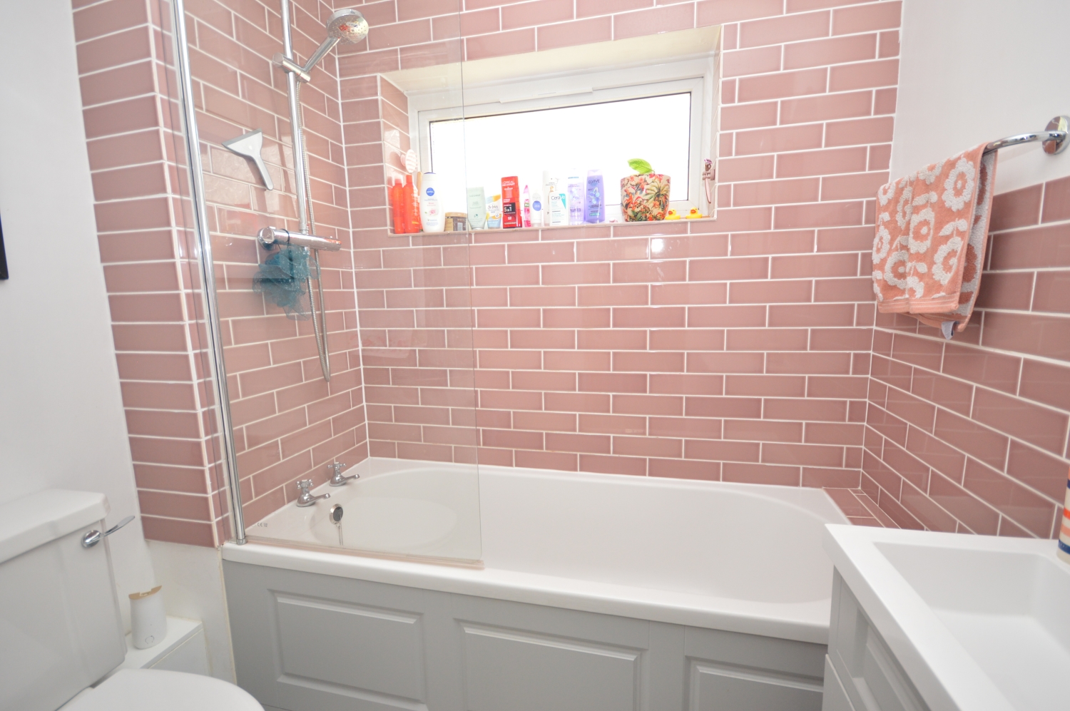 * Modern bathroom with shower over bath