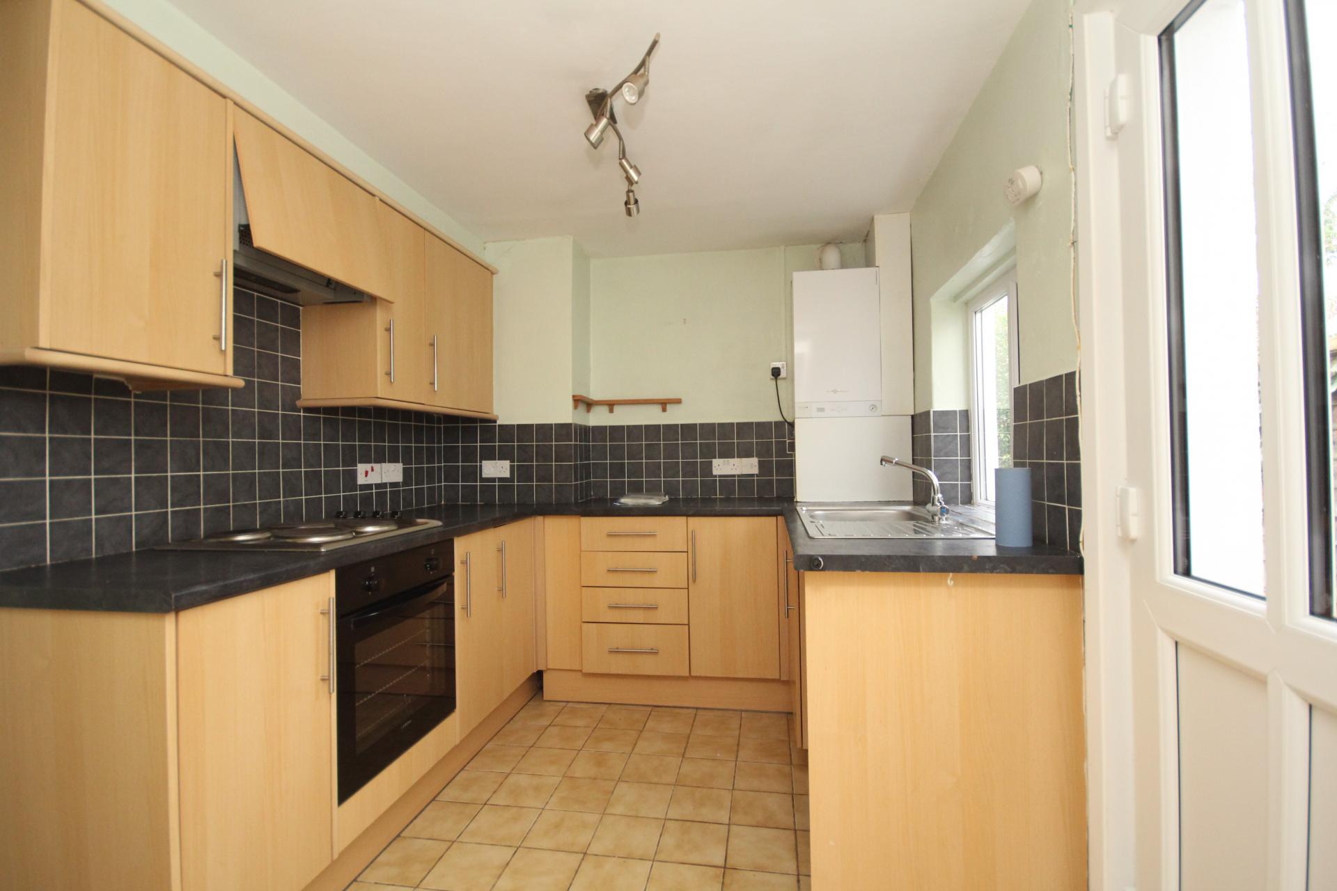 Double glazed window to side, stainless steel sink and drainer with cupboards under and a further range of matching base and wall units, four ring electric hob with extractor hood over and electric oven under, wall mounted gas boiler, ceramic wall tiling, tiled flooring, space for free standing fridge/freezer, space and plumbing for washing machine and part glazed door to rear garden.
