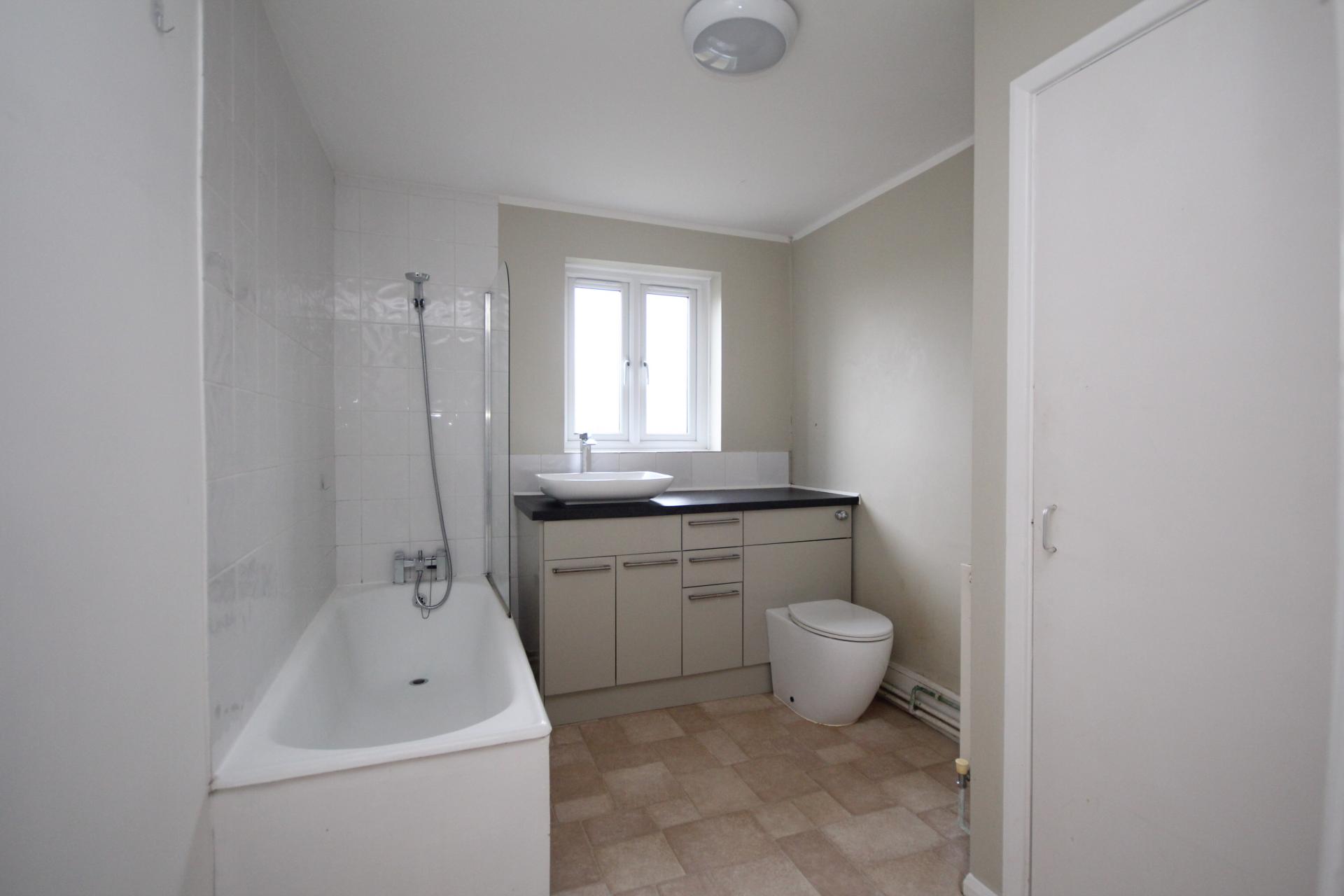 Double glazed frosted window to rear, low level W/C with concealed cistern, hand wash basin set within vanity unit, ceramic wall tiling, paneled bath with central mixer taps and hand shower piece, linen cupboard and radiator.
