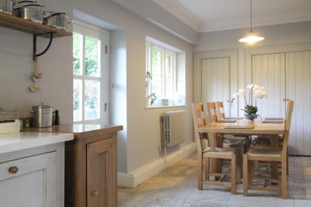 Kitchen/breakfast room: 23' 9 x 14' 5 (11.3m x 4.39m) max. Ceiling height: 8' 11 (2.73m) max. Casement windows to the rear and the side provide garden views as does the glazed door to the rear garden terrace. A country kitchen reflecting period features with bespoke Fired Earth free standing oak units, including a butcher's block, dresser and central island. Double Butler sink with lava stone draining boards with cupboards under. A three oven electric aga, integrated dishwasher, American-style fridge/freezer. Generous dining area with a range of hand painted cupboards incorporating storage space, shelving and hot water tank. Italian stone floor, bespoke cast iron radiators and inset lighting.