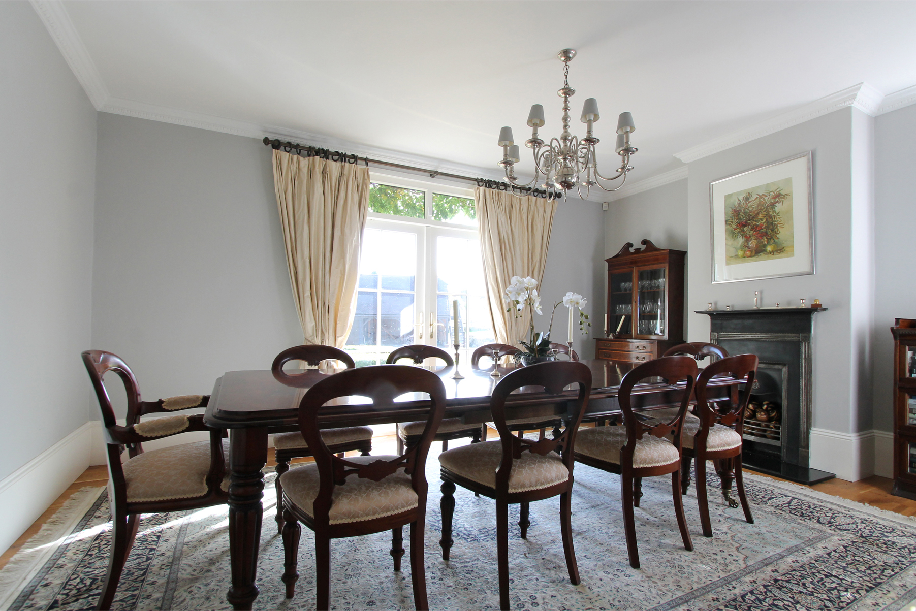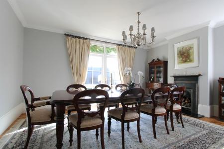 Dining room: 16' 4 x 12' 11 (4.97m x 3.94m) max. Ceiling height: 8' 11 (2.71m) max. A light and well proportioned double aspect room with French doors opening out to the front. Polished Oak floor boarding, period cast iron fireplace with decorative surround and mantle over black marble hearth, bespoke cast iron radiator, ornate cornicing and central chandelier.