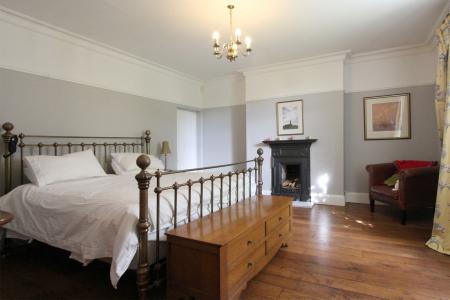 Principal bedroom: 15' 10 x 14' 8 (4.83m x 4.47m) max. Ceiling height: 8' 10 (2.69m) max. A delightful room with sash window, overlooking the front garden. Classic polished oak floor boarding, period cast iron fire place (capped) with pale marble hearth, picture rail, ornate cornicing, bespoke cast iron radiator and central chandelier.
