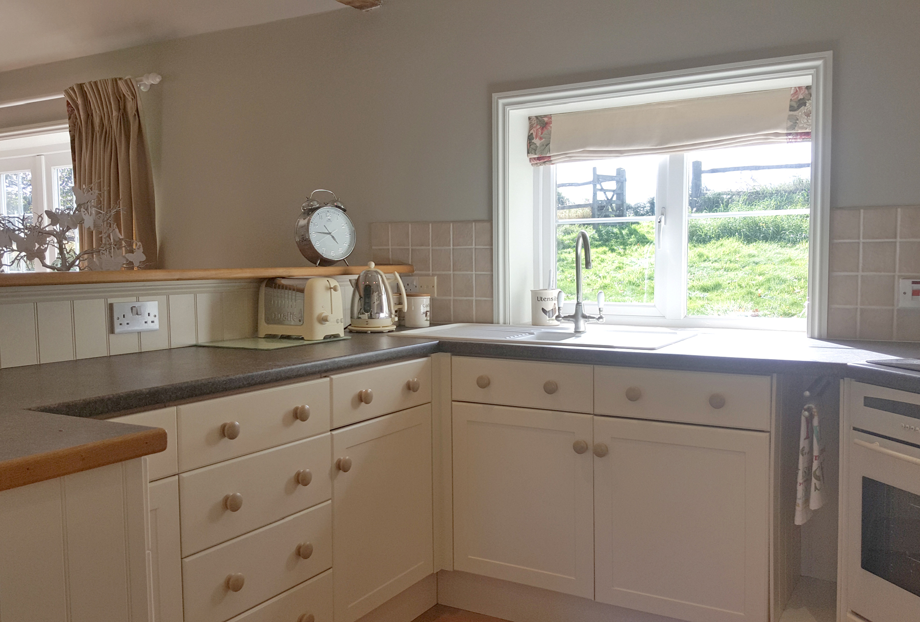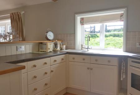 Laundry room: 9' 4 x 8.2 (3.0m x 2.5m) max. Ceiling height: 6' 9 (2.1m) max. Double butler sink with oak drainers to sides and cupboards under, shelves, plumbing for washing machine and space for tumble dryer. Slate floor, radiator and inset lighting.