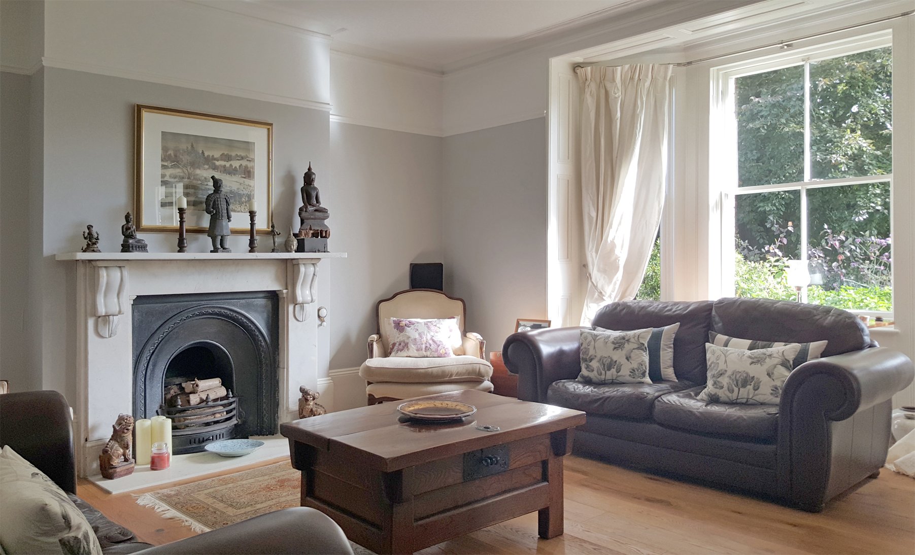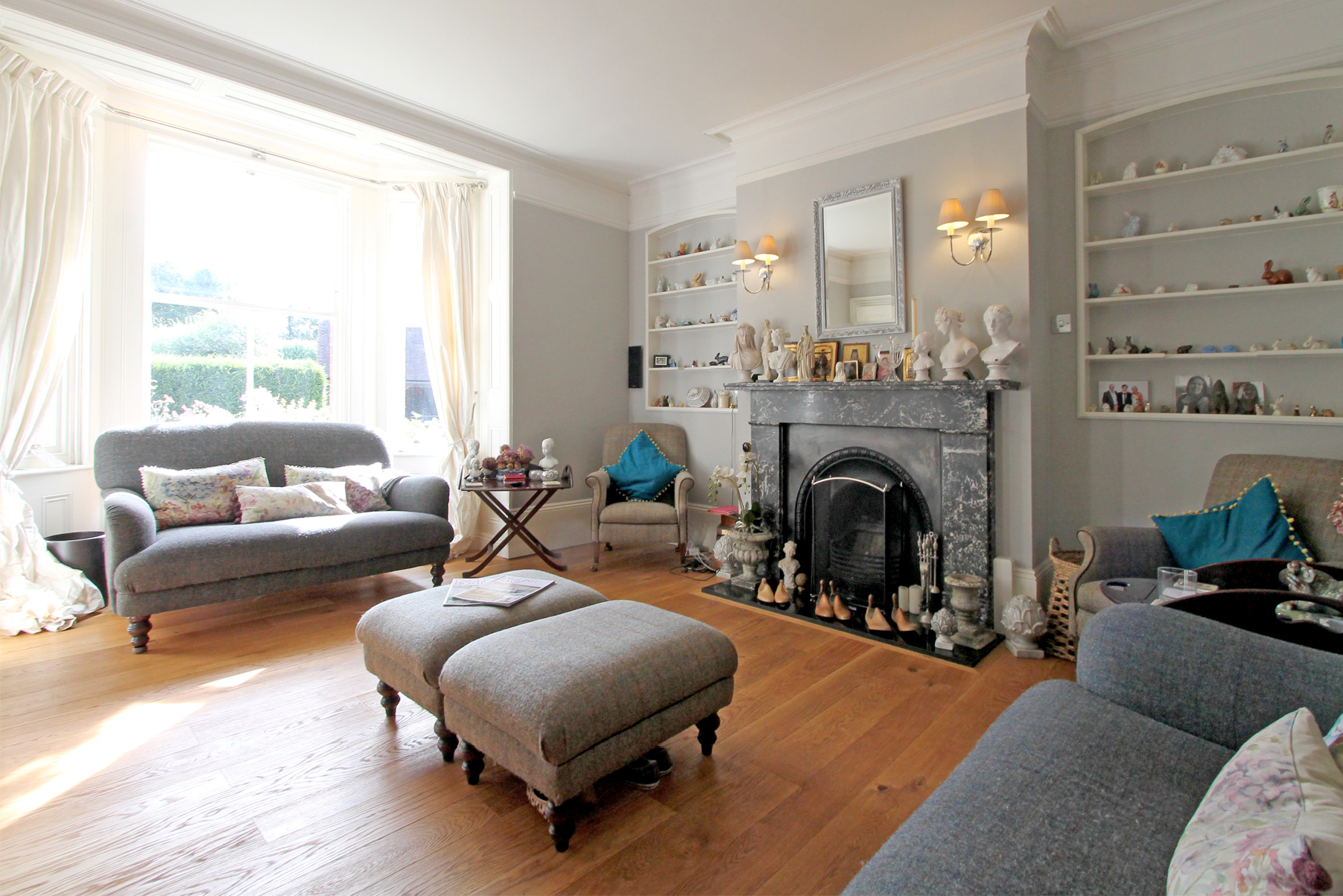 Sitting room: 17' 7 x 15' 1 (5.38m x 4.60m) max. Ceiling height: 9' 0 (2.74m) max.. An attractive room with matching sash bay windows with shutters to the front. Period cast iron fireplace with black marble hearth and an impressive black/white marble surround, matching mantle over. Classic polished oak floor boarding, bespoke cast iron radiators and wall lighting.