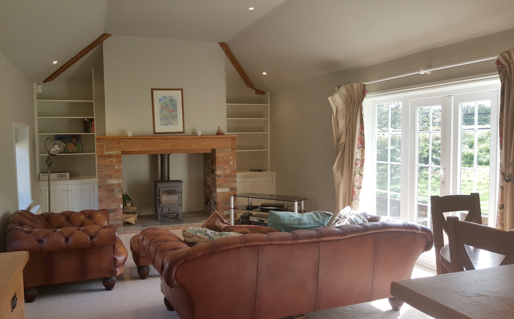 Sitting room: 37' 0 x 13' 2 (11.29m x 4.01m) max. Ceiling height: 9' 8 (2.94m). Double glazed UPVC French doors (with glazed side lights) open onto the terrace at the rear of the cottage. Double aspect open plan room with attractive brick fireplace, wood burning stove on a slate hearth and oak bressumer beam over, book shelves and storage cupboards to either side. Neutral fitted carpet, radiators, TV Point, BT Point and inset lighting.