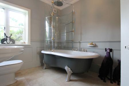 Family bathroom: 10' 3 x 7' 8 (3.13m x 2.35m) max. Ceiling height.: 8' 8 (2.66m) max. Casement windows overlooking the gardens to the rear. Hand painted room with beautiful Sottini white suite comprising WC, pedestal hand basin, free standing claw foot shower/bath, extractor, bespoke cast iron radiator and central crystal chandelier lighting.