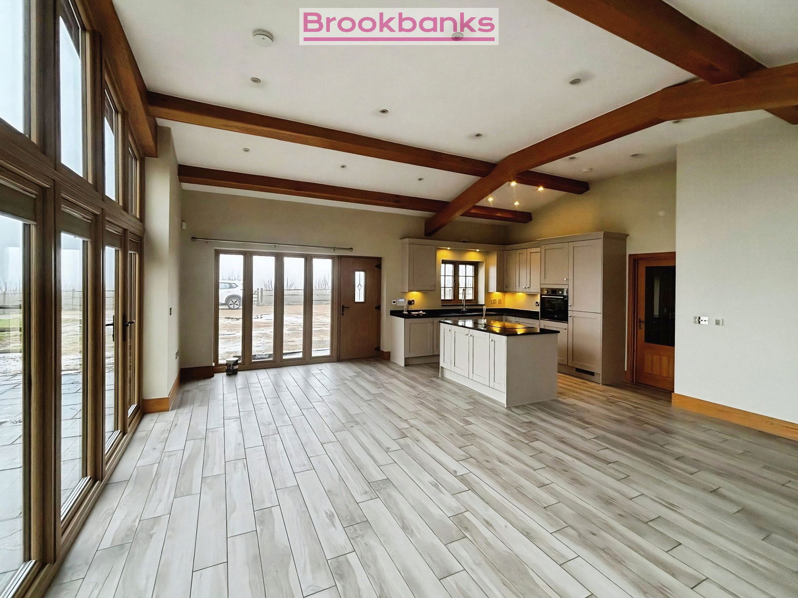 • • Kitchen island and large glass frontage