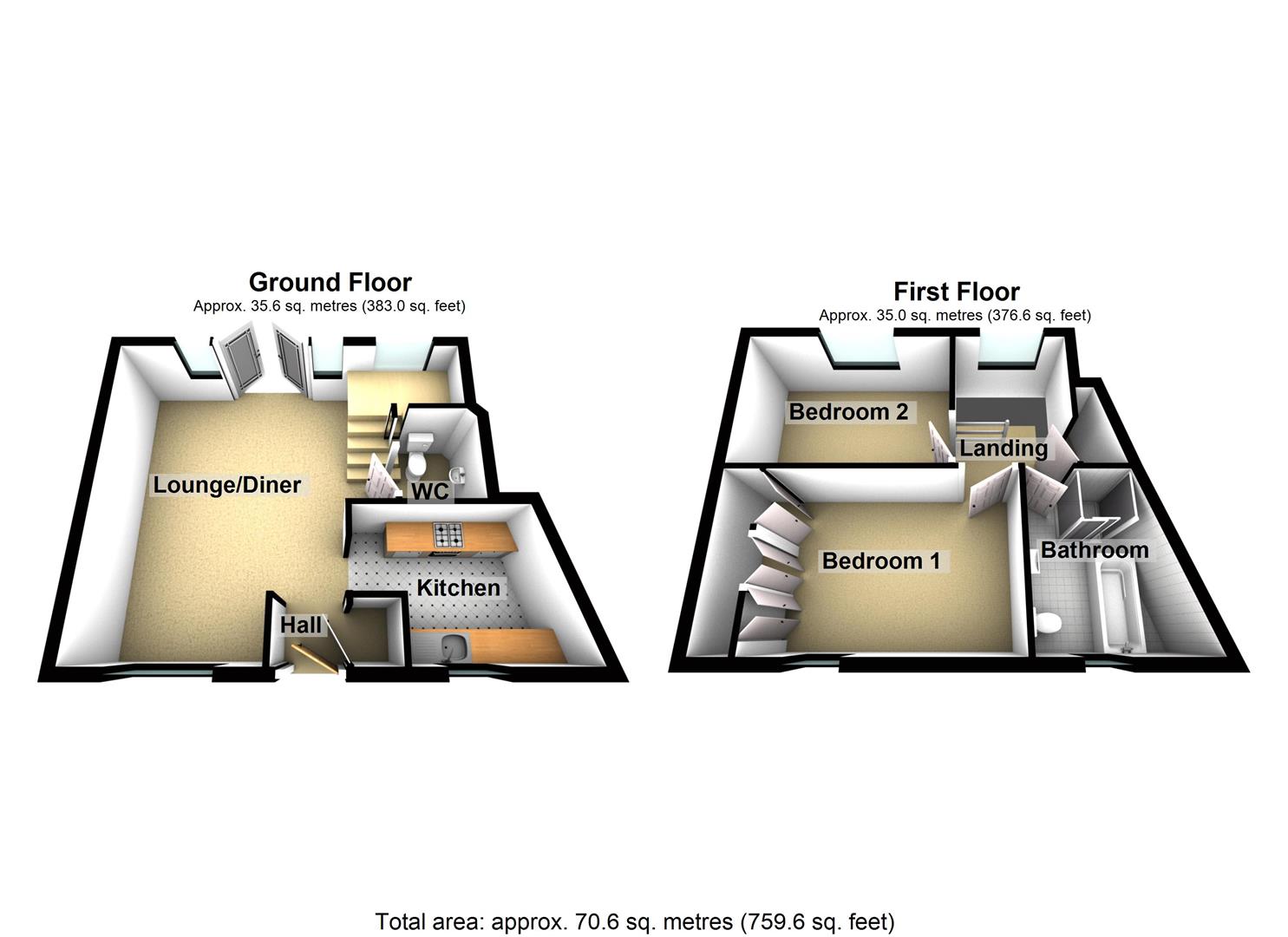 Lounge/Diner - 5.28m x 4.83m max (17'4" x 15'10" max) - Double-glazed French doors opening out to the rear garden. Two double-glazed picture windows to the rear. Shuttered double-glazed window to the front elevation. Television point. Telephone point. Wood effect laminate flooring. Two radiators. Doorway through to the kitchen. Stairs rise in to the first floor. Door to cloakroom/wc.