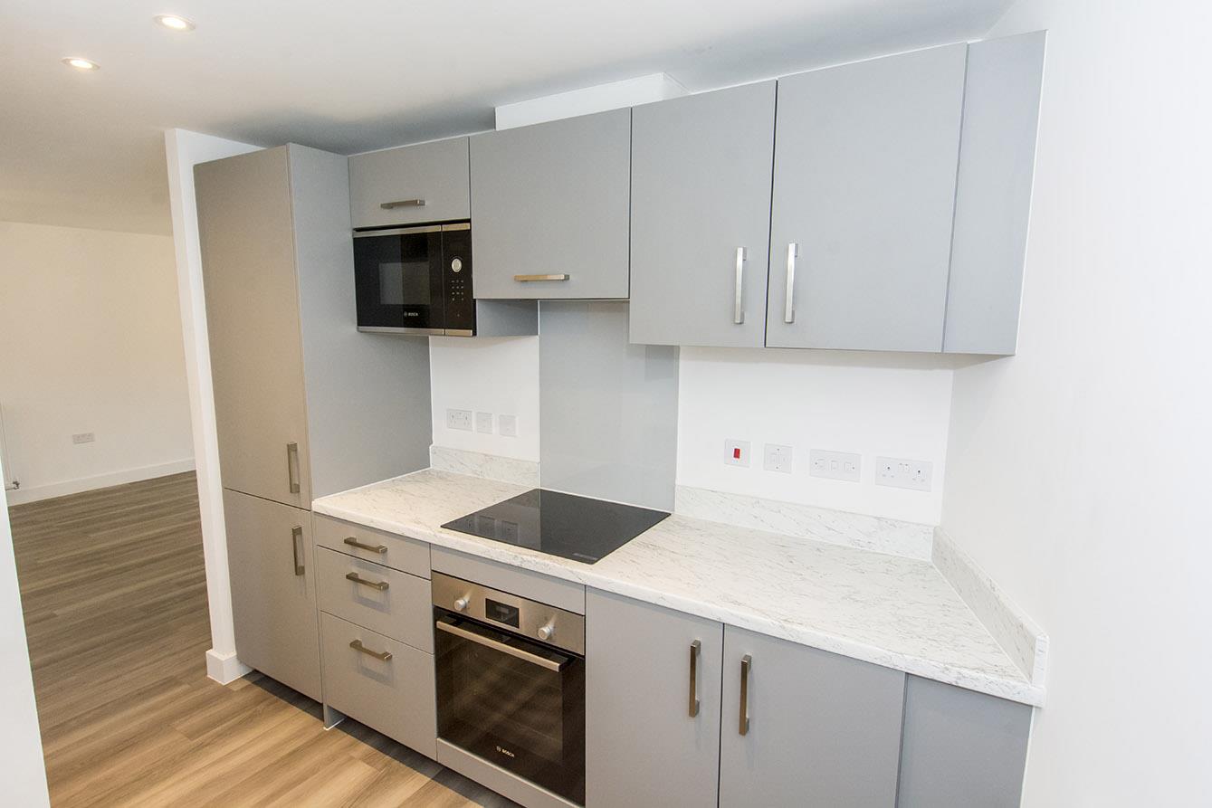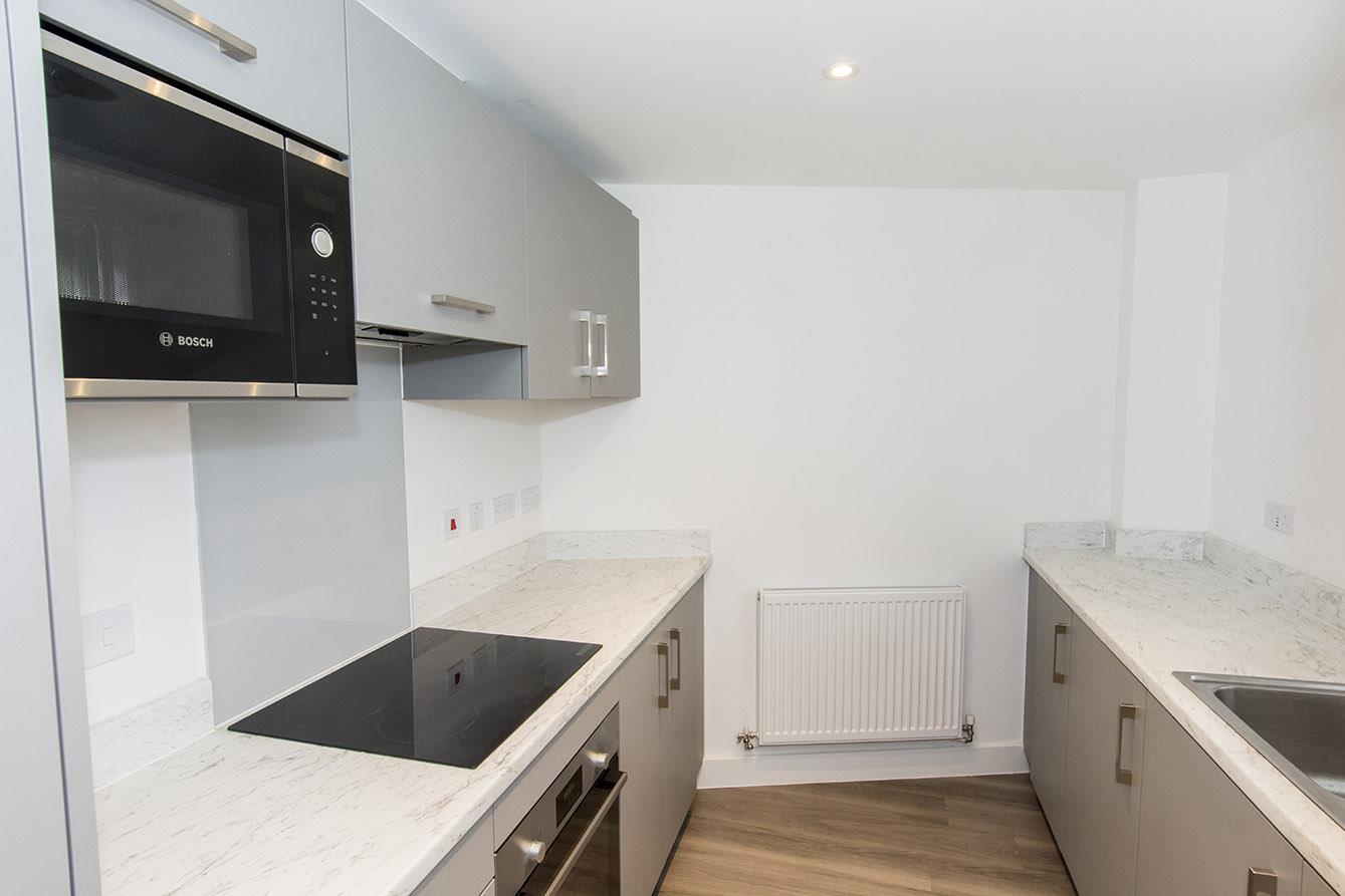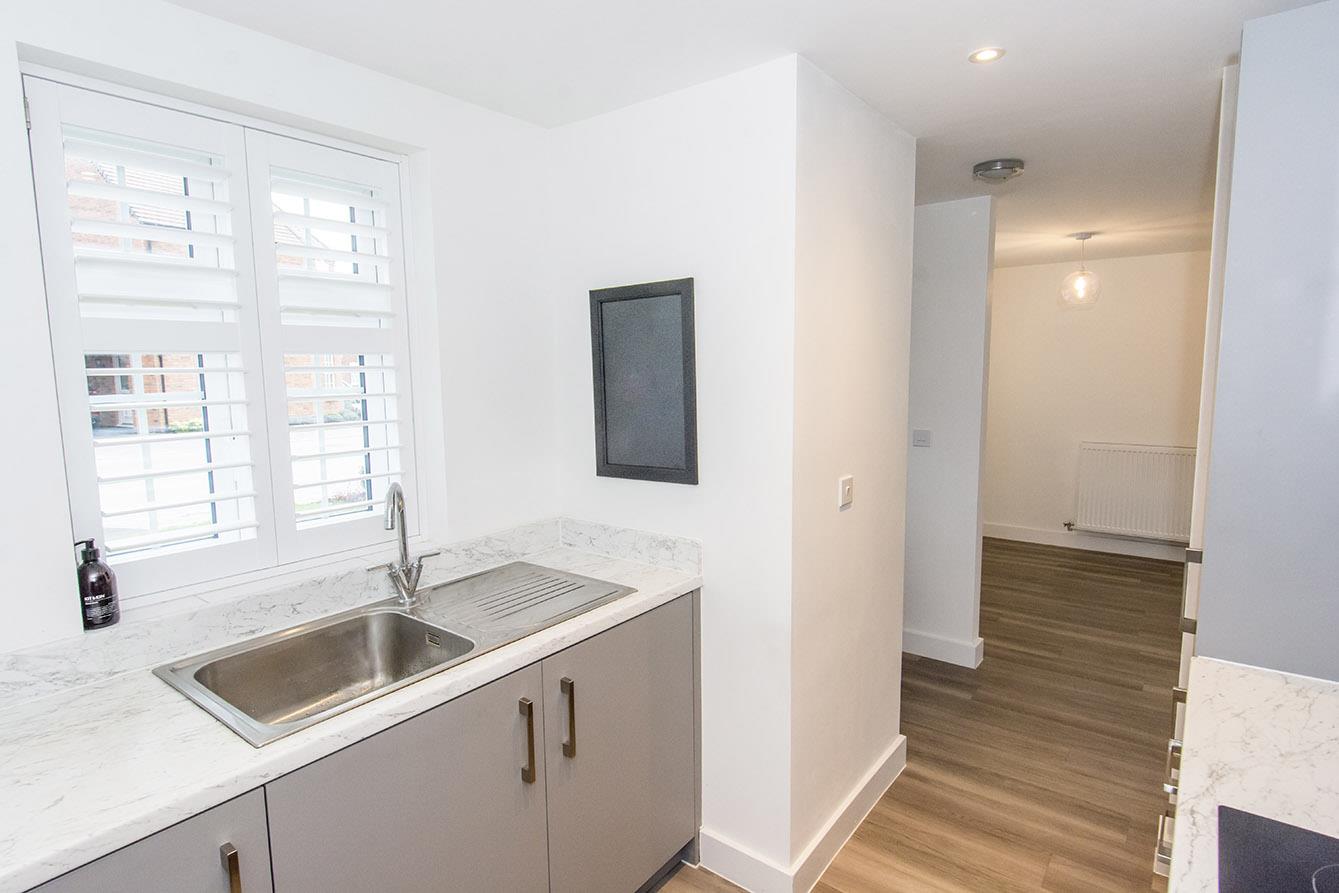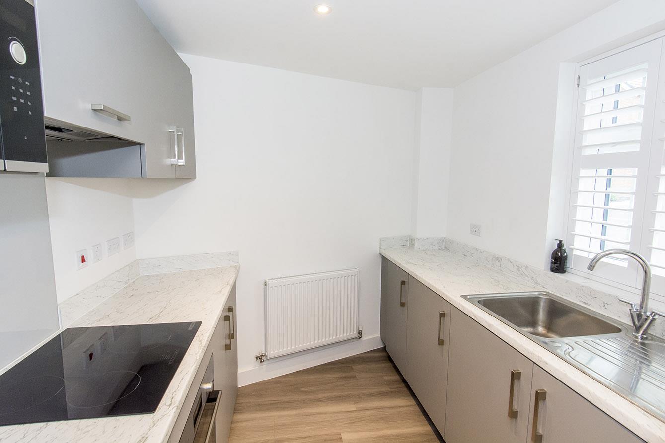 Kitchen - 2.87m x 2.36m (9'5" x 7'9") - Laminated work surfaces with matching splash backs. Fitted base and wall units. Fitted oven and four ring electric hob with extractor fan over. Fitted microwave. Automatic washing machine. Fridge and freezer. Stainless steel single sink and drainer. Wood effect laminate flooring. Double-glazed shuttered window to the front elevation.