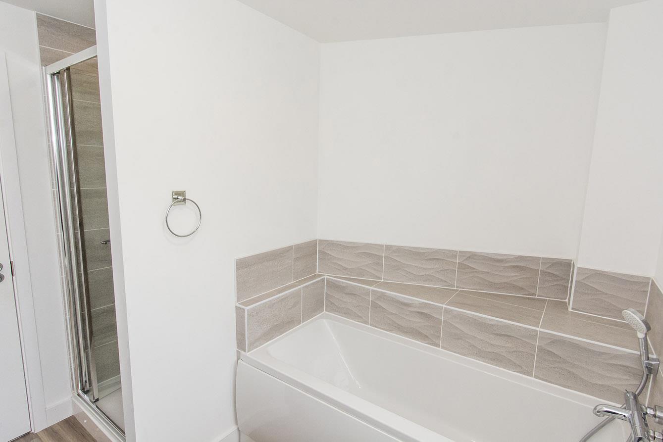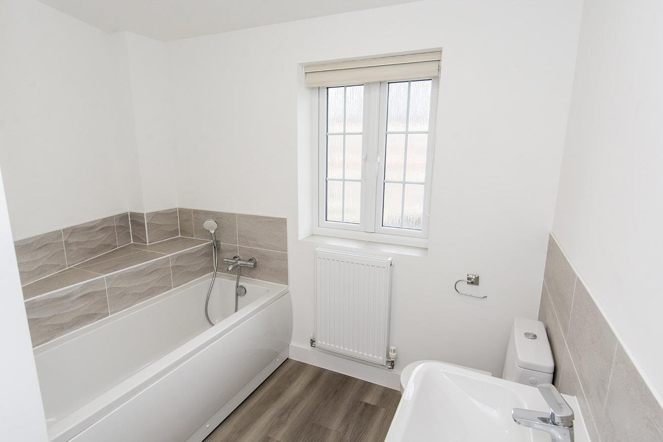 Bathroom - Panelled bath with mixer shower attachment. Pedestal wash hand basin. Low level wc. Tiled shower cubicle with mains shower fitment. Radiator. Wood effect laminate flooring. Complimentary tiling. Electric shaver point. Opaque double-glazed window.