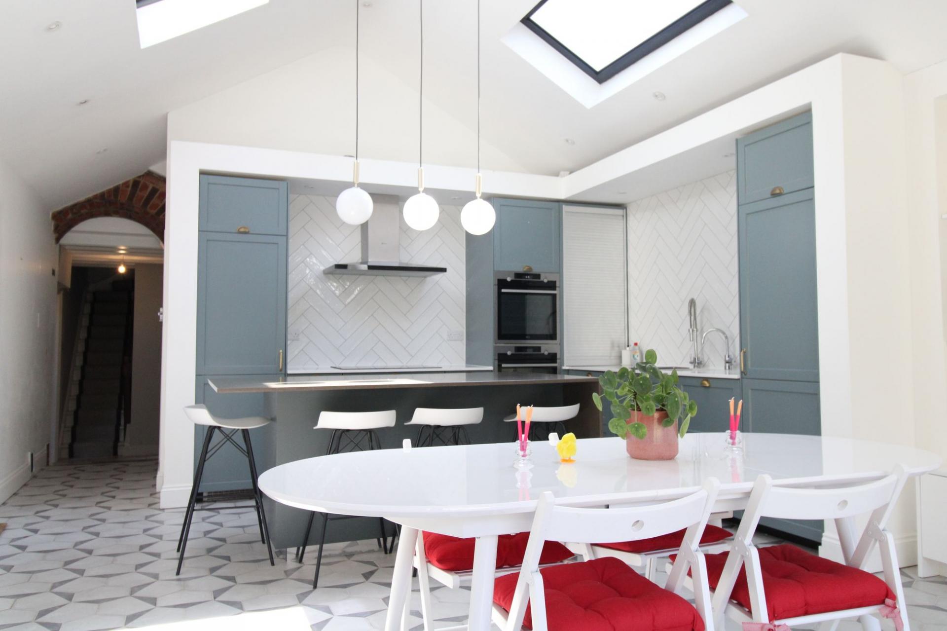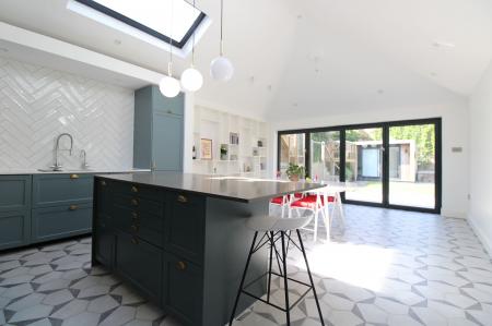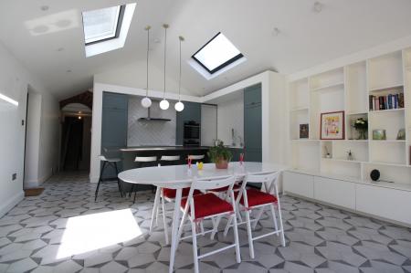 The heart of the home is the breath-taking open-plan kitchen and dining area — an exceptional space designed for modern living and entertaining. With high ceilings, exposed brickwork, and stylish bifold doors opening onto the garden, the kitchen is a true showpiece. It boasts a large stone island with ample storage, high-spec integrated appliances including a double oven, dishwasher, fridge and freezer, and is beautifully finished with elegant floor tiling throughout. A separate utility room off the kitchen provides additional space for white goods, including a washing machine and tumble dryer, offering practical storage solutions and keeping the main living areas clutter-free. Extra-large skylights flood the space with natural light, and a side door leads conveniently to a decked area and discreet storage/bin area.